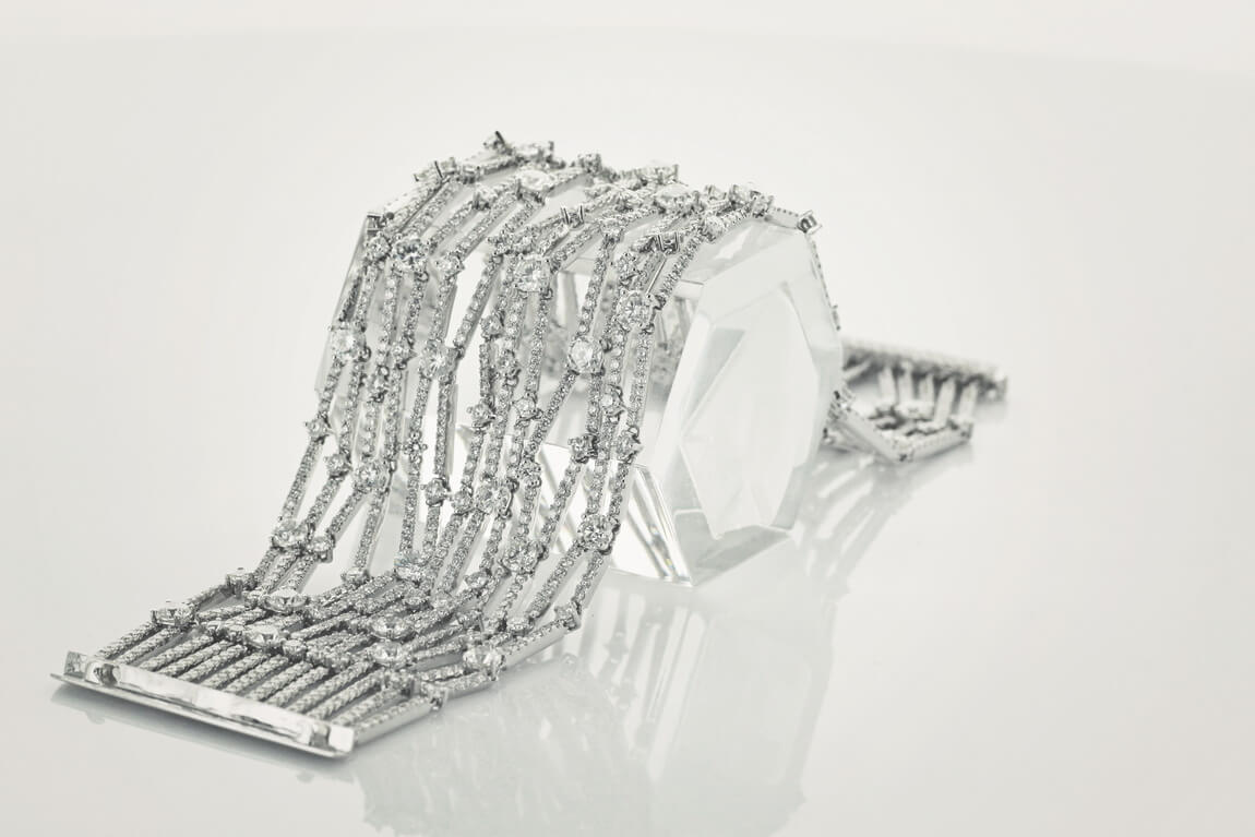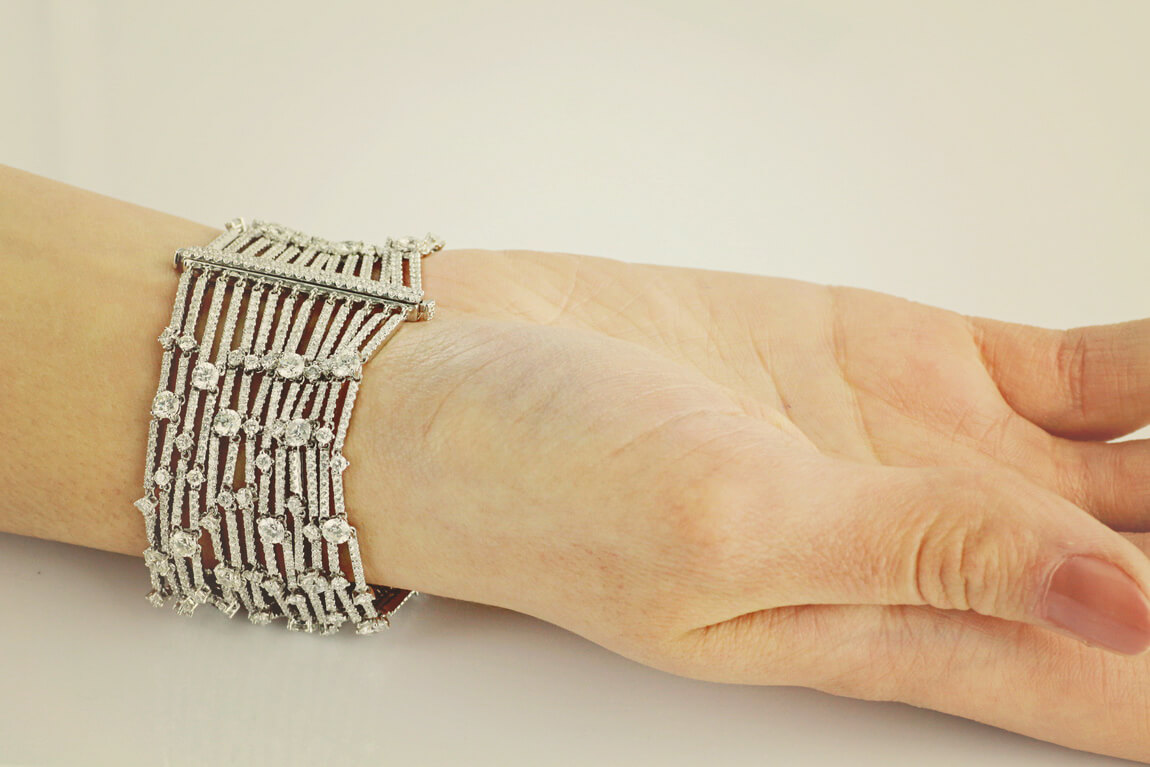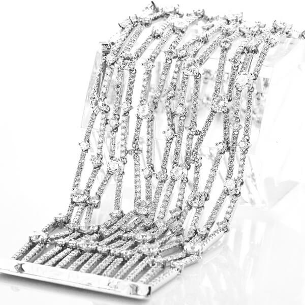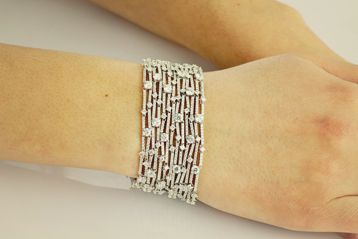 Působivý 18 cm náramek z 18karátového bílého zlata (750‰). Široká, elegantní konstrukce vytváří hustou mřížku z 1 242 precizně vsazených diamantů o celkové hmotnosti 23,65 ct (barva G-H, čistota SI1). Kamínky jsou uspořádány do kaskádového vzoru připomínajícího tekoucího hrdla, který jemně obepíná zápěstí a dodává mu sofistikovaný, luxusní