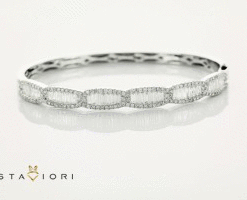 Zmysłowa bransoleta z 18-karatowego białego złota próby 0,750, w której misternie zestawiono 42 diamenty bagietkowe i 138 brylantów. Diamenty bagietkowe układają się w eleganckie, wydłużone ogniwa, otoczone migoczącymi akcentami mniejszych kamieni, co tworzy efekt subtelnej koronki świetlnej. Ten luksusowy wzór doskonale podkreśla blask i wielowymiarowość diamentów, a smukła forma biżuterii dodaje całości wyjątkowej lekkości i wyrafinowania.