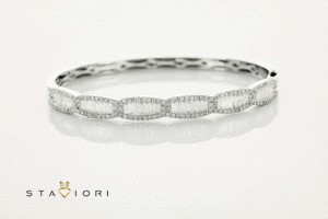 Tento jemný náramek je zhotoven z 18karátového bílého zlata (750‰) a kombinuje 42 bagetových diamantů s 138 briliantovými kamínky. Bagetové diamanty vytvářejí elegantní protáhlá články, obklopené zářivou aurou menších briliantů, čímž vzniká efektní světelná krajka. Luxusní design zvýrazňuje mnohorozměrný třpyt diamantů, zatímco štíhlý tvar dodává šperku vybranou jemnost.