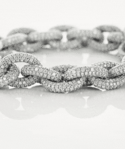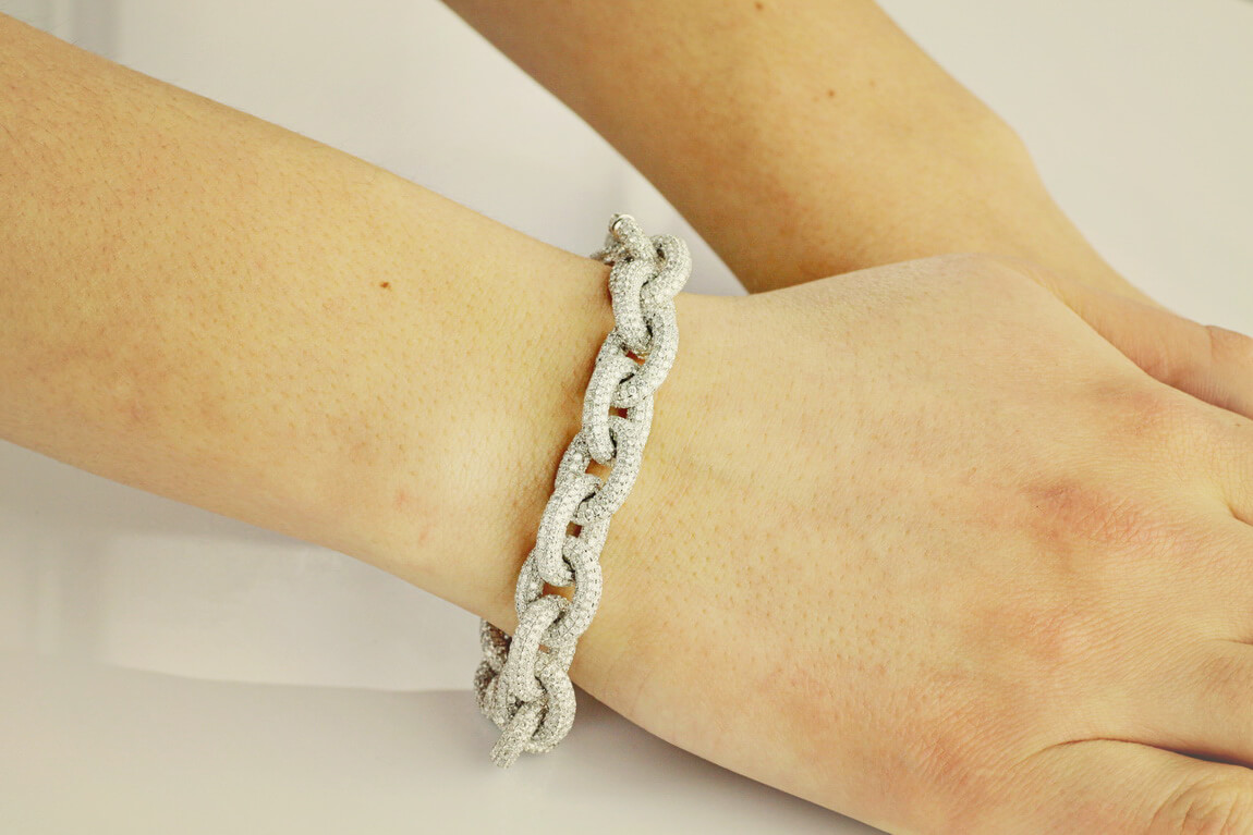 Impozantní náramek z 18karátového bílého zlata (750‰), osázený 4 443 brilianty o celkové hmotnosti 41,38 ct (barva G–H, čistota SI1). Mistrovsky zpracovaný do tvaru článků řetězu, ukazuje mimořádnou zručnost klenotníků, zatímco třpyt kamínků vytváří okouzlující hru světla. Je to skutečné pocta preciznosti a luxusu, která se skvěle hodí k elegantním večerním outfitům.