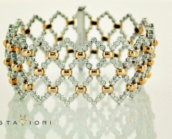 Luxusní náramek ze zlata ryzosti 0,750 v kombinaci bílého a růžového zlata je skutečným klenotnickým skvostem. Precizní výplet je osazen 306 brilianty o celkové hmotnosti 6,38 ct, které nádherně září. Elegantní design o šířce 27 mm vyniká na zápěstí a tvoří výjimečný šperk pro slavnostní příležitosti. Ideální volba pro ženy s vytříbeným vkusem.