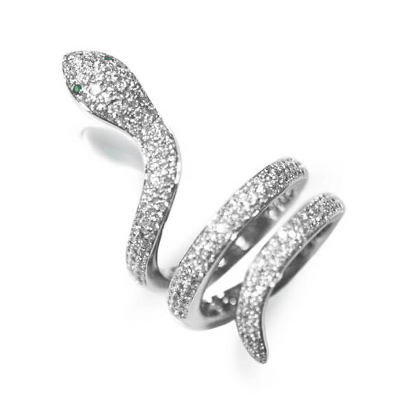Úchvatný prsten ve tvaru kroutícího se hada je odvážným šperkem pro ženy, které ocení osobitý styl. Je vyroben z bílého zlata nejvyšší kvality 0,750 a září leskem až 234 diamantů o celkové hmotnosti 1,30 ct. Hypnotické zelené granáty, zasazené jako oči, dodávají celku tajemné kouzlo. Prsten smyslně obepíná prst a vytváří mimořádný vizuální efekt - je ideální pro večerní styling i jako šperkařské mistrovské dílo.