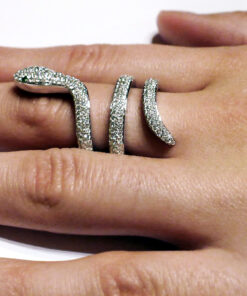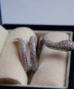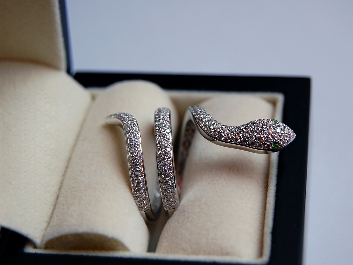 Okouzlující prsten ve tvaru vinoucího se hada je šperkem pro ženy, které milují výrazný styl. Vyroben z bílého zlata ryzosti 0,750 a osazen 234 brilianty o celkové hmotnosti 1,30 ct, září jedinečným leskem. Dva zelené granáty jako oči dodávají prstenu tajuplný výraz. Elegantní tvar se smyslně ovíjí kolem prstu a vytváří nepřehlédnutelný efekt - ideální pro večerní příležitosti i jako výjimečný klenot do sbírky.
