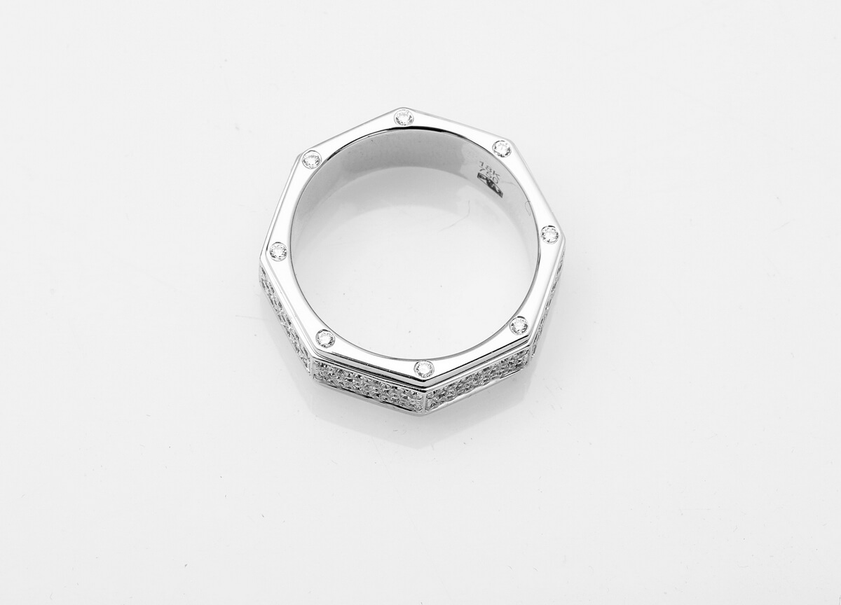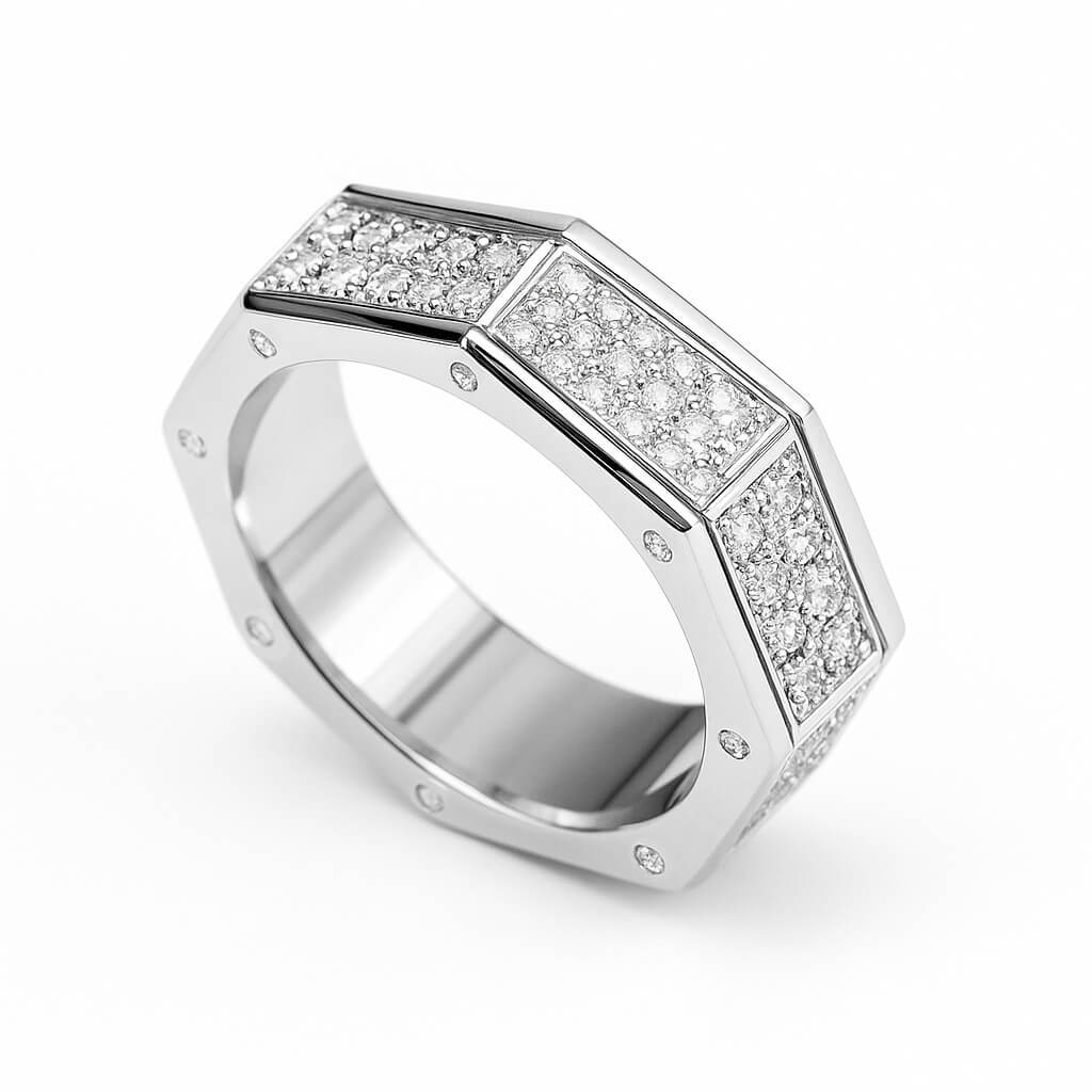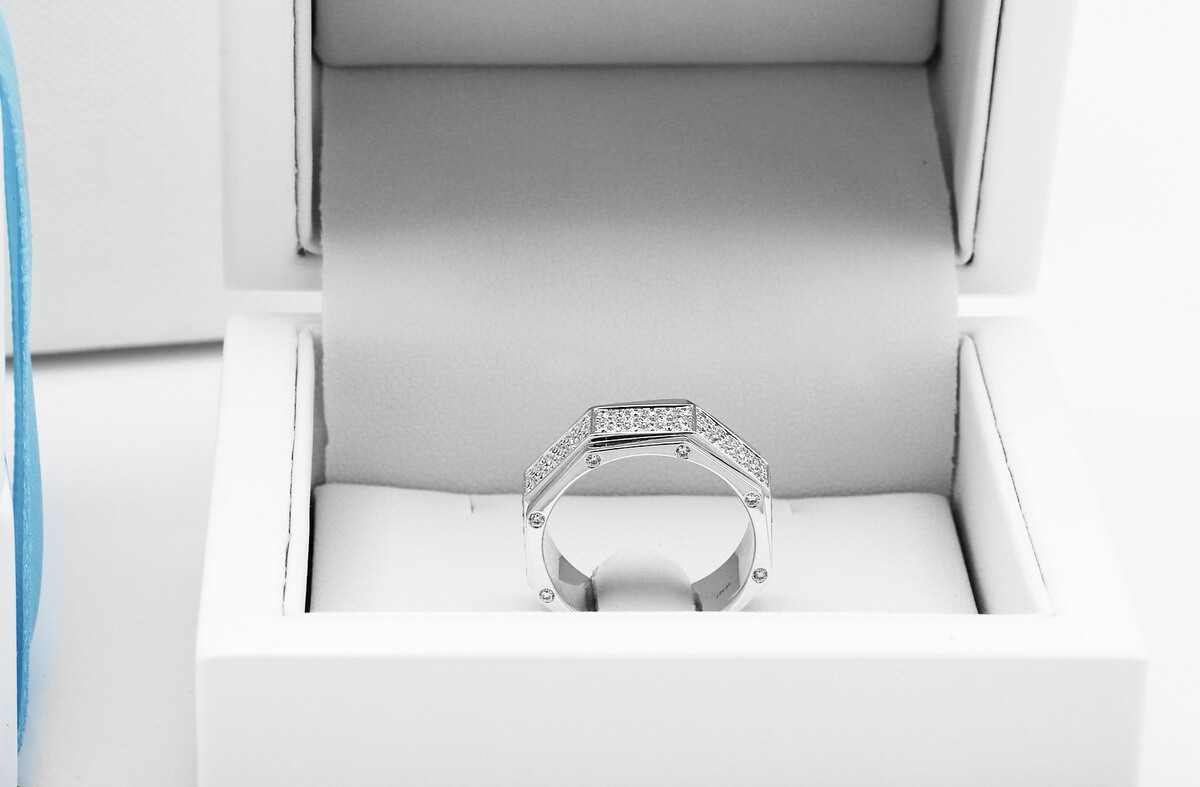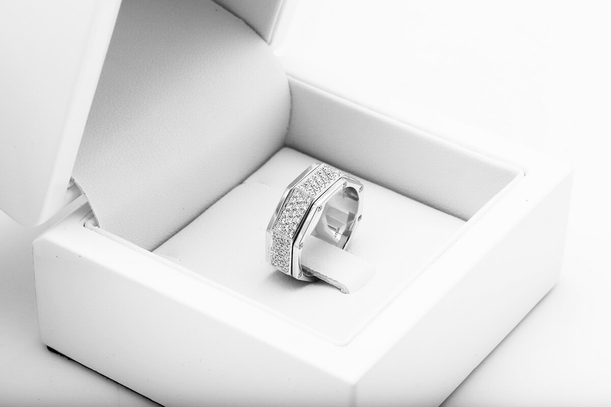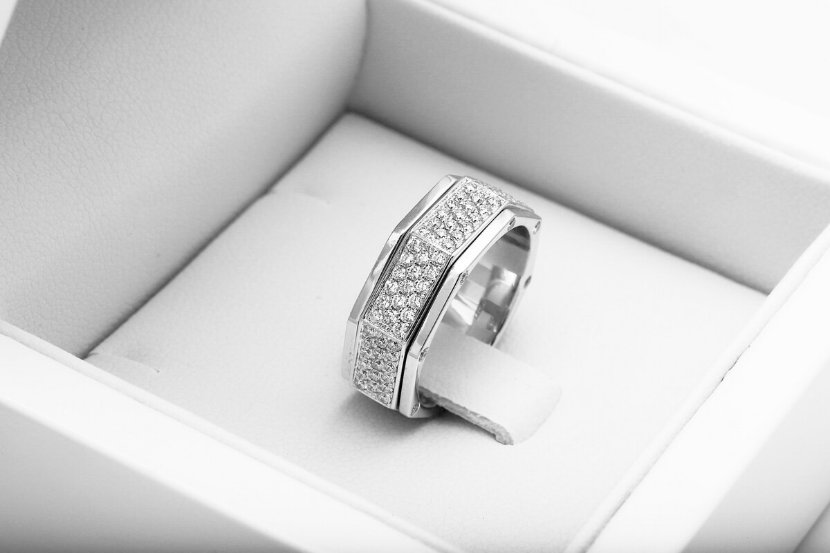 Oryginalny pierścionek z białego złota próby 0,750 o unikalnej ośmiokątnej formie, która od razu przyciąga wzrok. Biżuteria została wysadzana aż 152 diamentami o łącznej masie 1,16 ct, lśniącymi w szlifie brylantowym. Szczególną cechą pierścionka jest ruchoma, zewnętrzna obrączka, która obraca się wokół wewnętrznej części – połączenie elegancji z elementem nowoczesnej zabawy formą. To idealny wybór dla mężczyzn i kobiet ceniących niebanalne projekty i kunszt jubilerski.