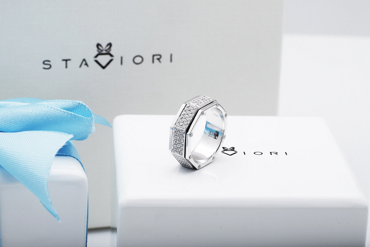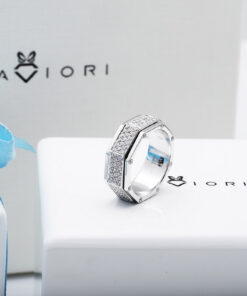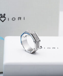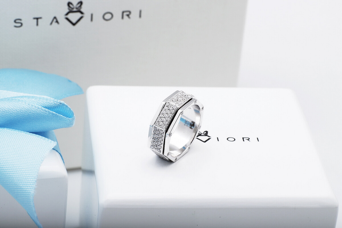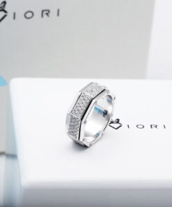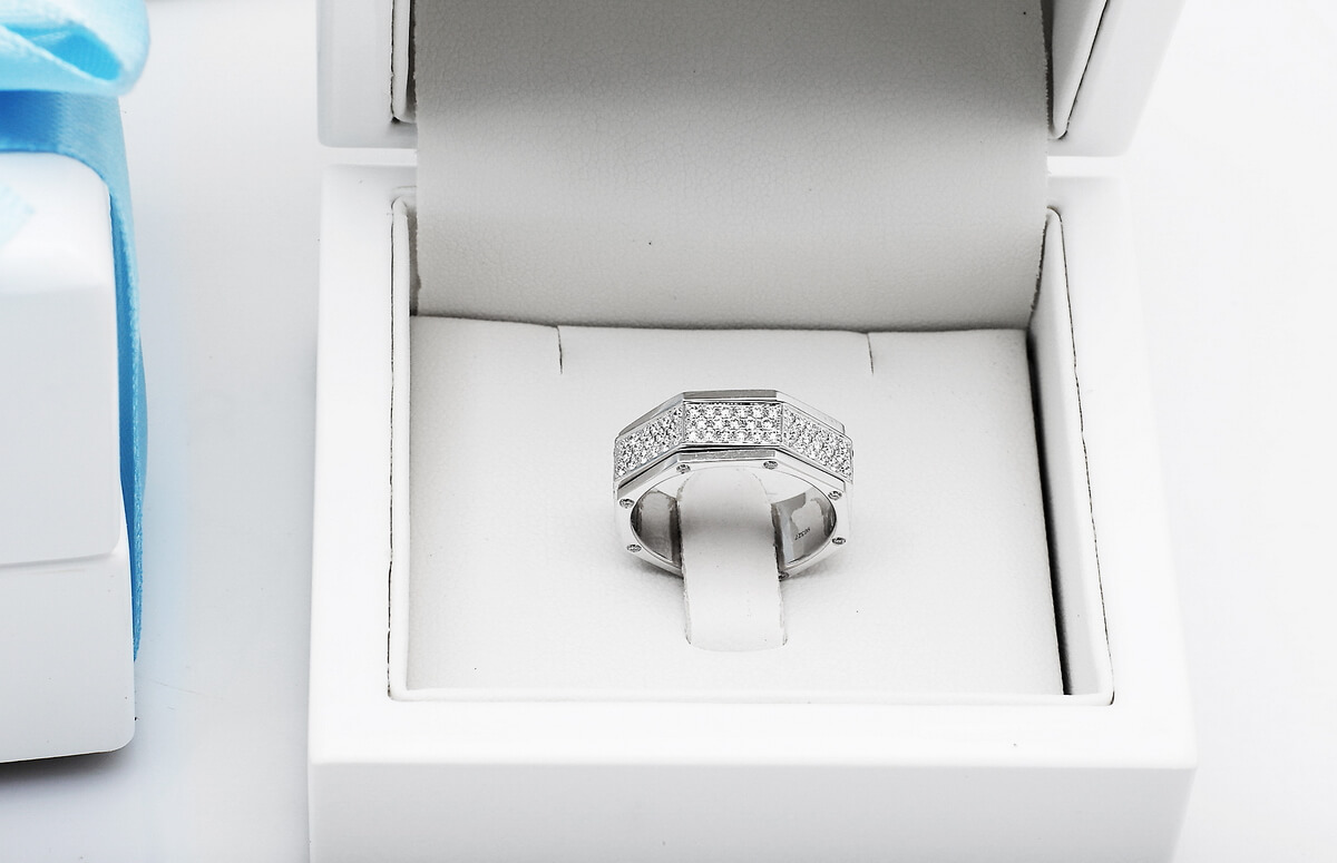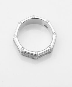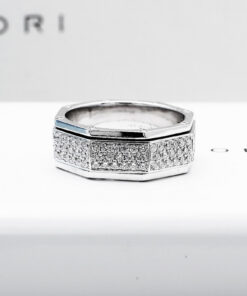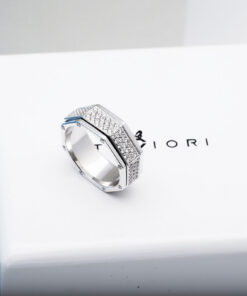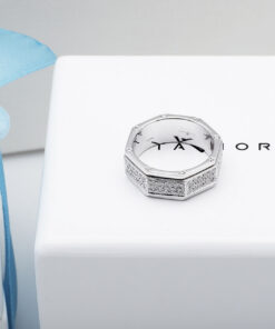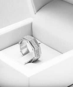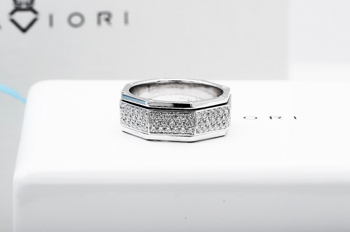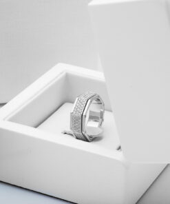 Oryginalny pierścionek z białego złota próby 0,750 o unikalnej ośmiokątnej formie, która od razu przyciąga wzrok. Biżuteria została wysadzana aż 152 diamentami o łącznej masie 1,16 ct, lśniącymi w szlifie brylantowym. Szczególną cechą pierścionka jest ruchoma, zewnętrzna obrączka, która obraca się wokół wewnętrznej części – połączenie elegancji z elementem nowoczesnej zabawy formą. To idealny wybór dla mężczyzn i kobiet ceniących niebanalne projekty i kunszt jubilerski.