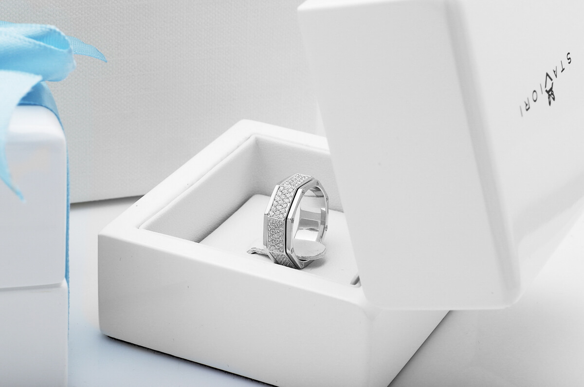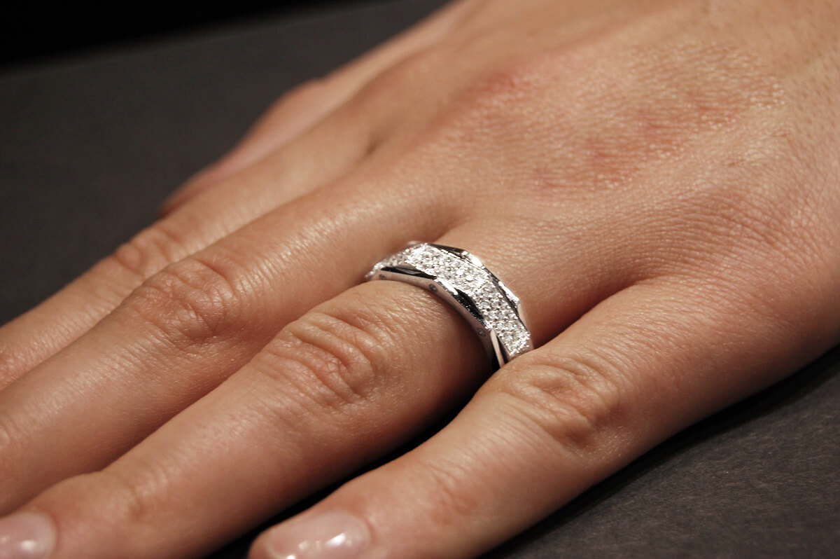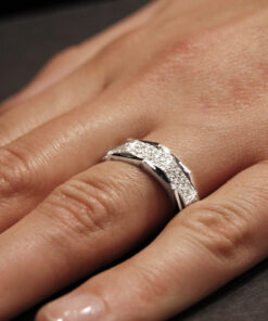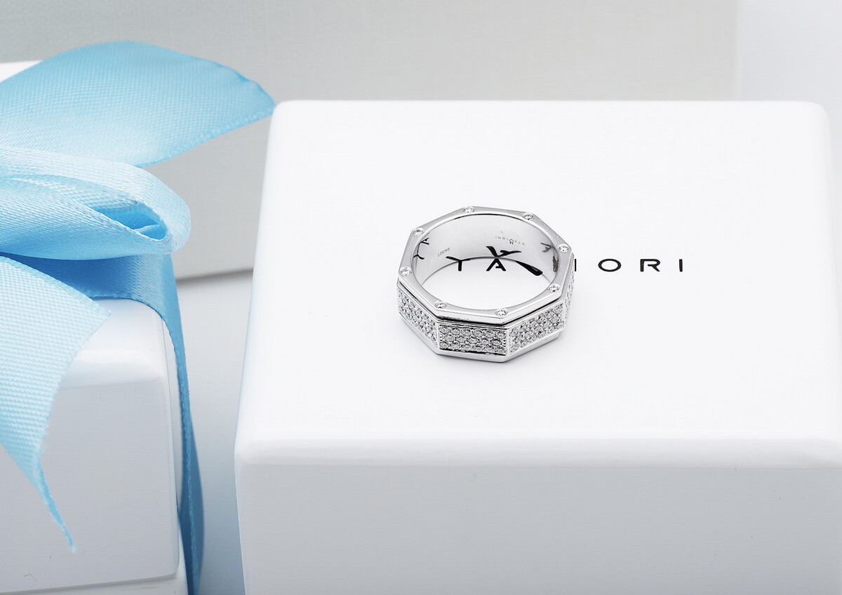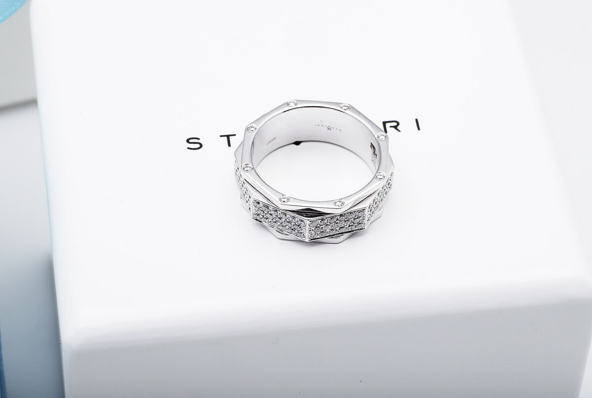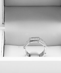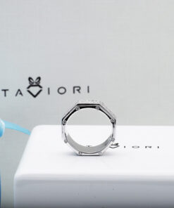 Oryginalny pierścionek z białego złota próby 0,750 o unikalnej ośmiokątnej formie, która od razu przyciąga wzrok. Biżuteria została wysadzana aż 152 diamentami o łącznej masie 1,16 ct, lśniącymi w szlifie brylantowym. Szczególną cechą pierścionka jest ruchoma, zewnętrzna obrączka, która obraca się wokół wewnętrznej części – połączenie elegancji z elementem nowoczesnej zabawy formą. To idealny wybór dla mężczyzn i kobiet ceniących niebanalne projekty i kunszt jubilerski.