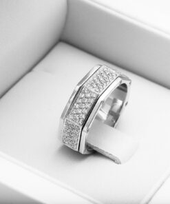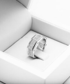 Výjimečný prsten z bílého zlata ryzosti 0,750 s originálním osmiúhelníkovým tvarem, který okamžitě zaujme. Osazen 152 brilianty o celkové hmotnosti 1,16 ct, které dodávají šperku oslnivý lesk. Unikátní je otočný vnější prstenec, který se volně pohybuje kolem vnitřní části – elegantní a zároveň hravý detail. Skvělá volba pro milovníky výjimečných designů a precizní šperkařské práce.