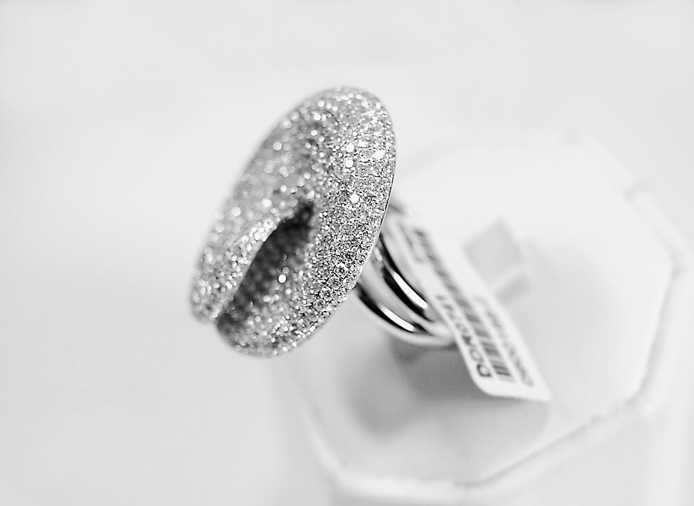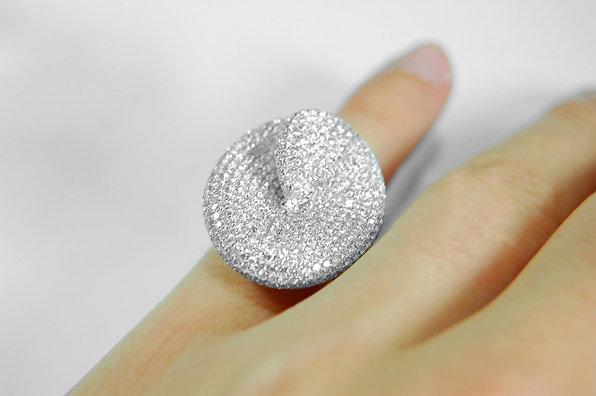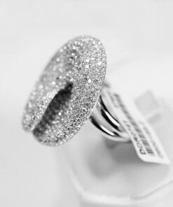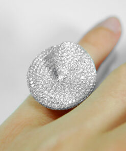 Spektakularny pierścionek z białego złota 18K, którego wyjątkowa korona o średnicy 25 mm zachwyca niezwykłym blaskiem. Aż 429 diamentów o łącznej masie 4,14 ct tworzy hipnotyzujący efekt świetlnych refleksów, podkreślony centralnie oprawionym brylantem. To biżuteria pełna luksusu i charakteru – idealna dla kobiet, które pragną wyróżniać się niepowtarzalnym stylem.