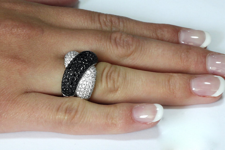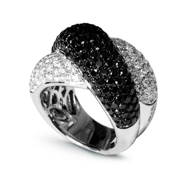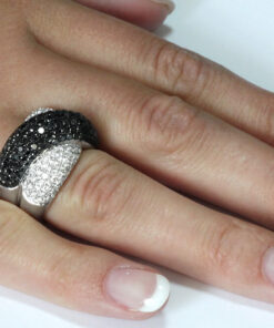 Wyjątkowy pierścionek z białego złota próby 750, którego design zachwyca kontrastem czerni i bieli. 92 lśniące diamenty o łącznej masie 1,36 ct oraz 138 czarnych diamentów o masie 2,86 ct tworzą niezwykle efektowną kompozycję pełną blasku i elegancji. Szeroka, przeplatająca się forma nadaje mu nowoczesny charakter i sprawia, że jest to biżuteria idealna dla kobiet ceniących wyraziste dodatki i luksusowy styl.
