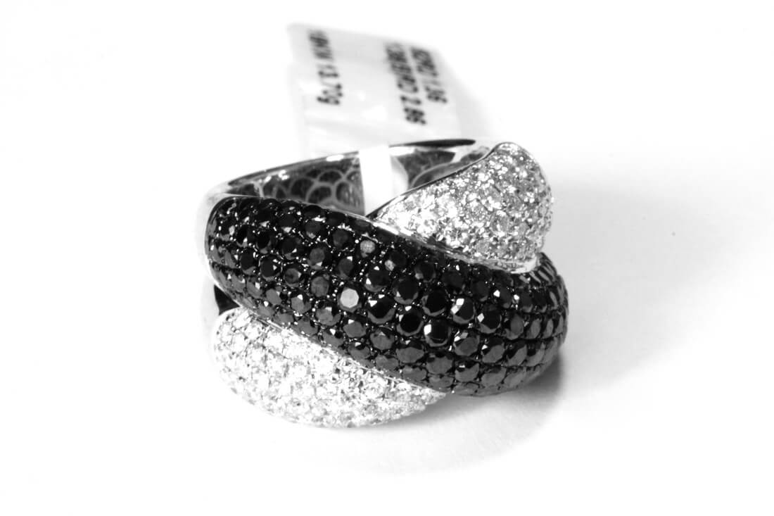Výjimečný prsten z bílého zlata 750, který okouzluje kontrastem černé a bílé. Osazený 92 briliantovými diamanty o celkové hmotnosti 1,36 ct a 138 černými diamanty o hmotnosti 2,86 ct vytváří působivou kompozici plnou jasu a elegance. Široký, propletený design dodává prstenu moderní charakter – ideální pro ženy, které si cení výrazných šperků a luxusního stylu.