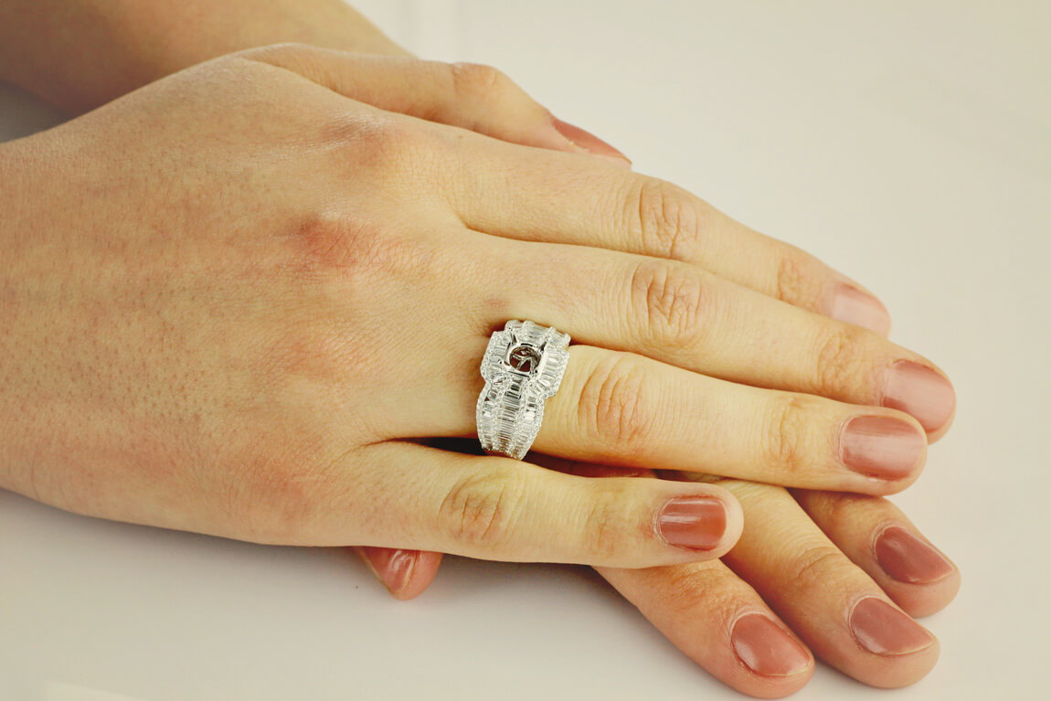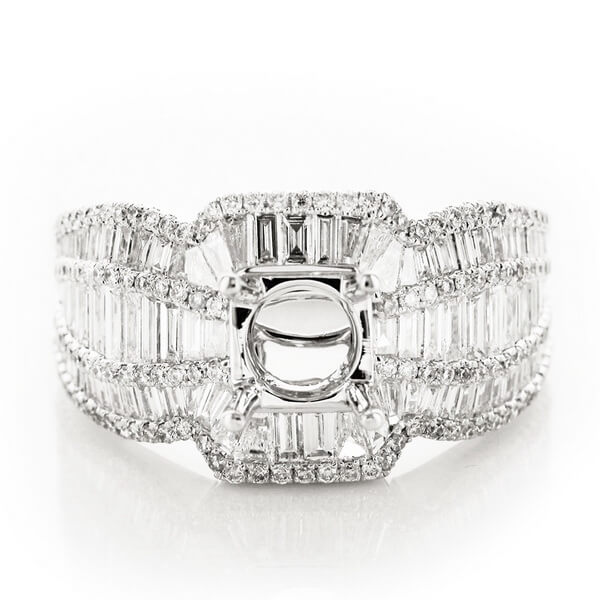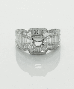 Luksusowy pierścionek zaręczynowy z białego złota próby 18K, który zachwyca imponującą kompozycją aż 234 diamentów o łącznej masie ponad 2,30ct. Trzy warstwy perfekcyjnie oszlifowanych brylantów i bagietek tworzą spektakularny efekt blasku i głębi. Centralne gniazdo umożliwia oprawę dowolnego diamentu powyżej 0,50ct lub innego kamienia, co czyni ten model wyjątkowo personalizowanym. Idealny dla kobiet ceniących wyrafinowaną elegancję i biżuterię najwyższej klasy.