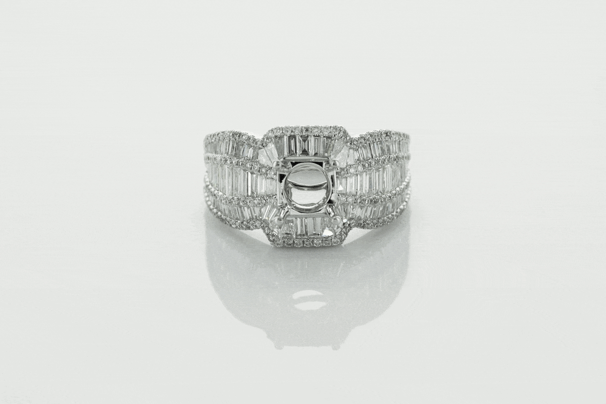 Luxusní zásnubní prsten z bílého zlata 18K, který oslní bohatým osazením 234 diamanty o celkové váze přes 2,30 ct. Tři vrstvy briliantů a bagetových výbrusů vytvářejí oslnivý efekt třpytu a hloubky. Centrální lůžko je připraveno pro diamant nad 0,50 ct podle individuálního výběru, což činí tento šperk naprosto jedinečným. Ideální volba pro ženy, které milují špičkový styl a výjimečné zpracování.