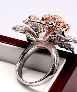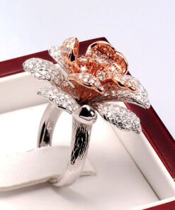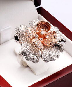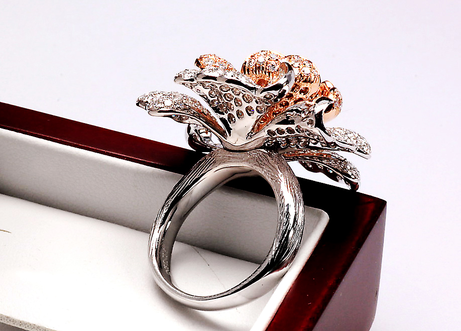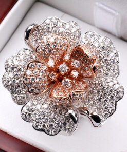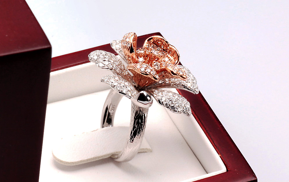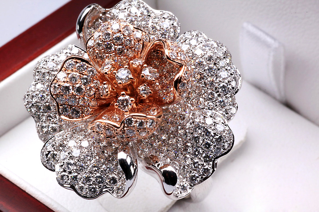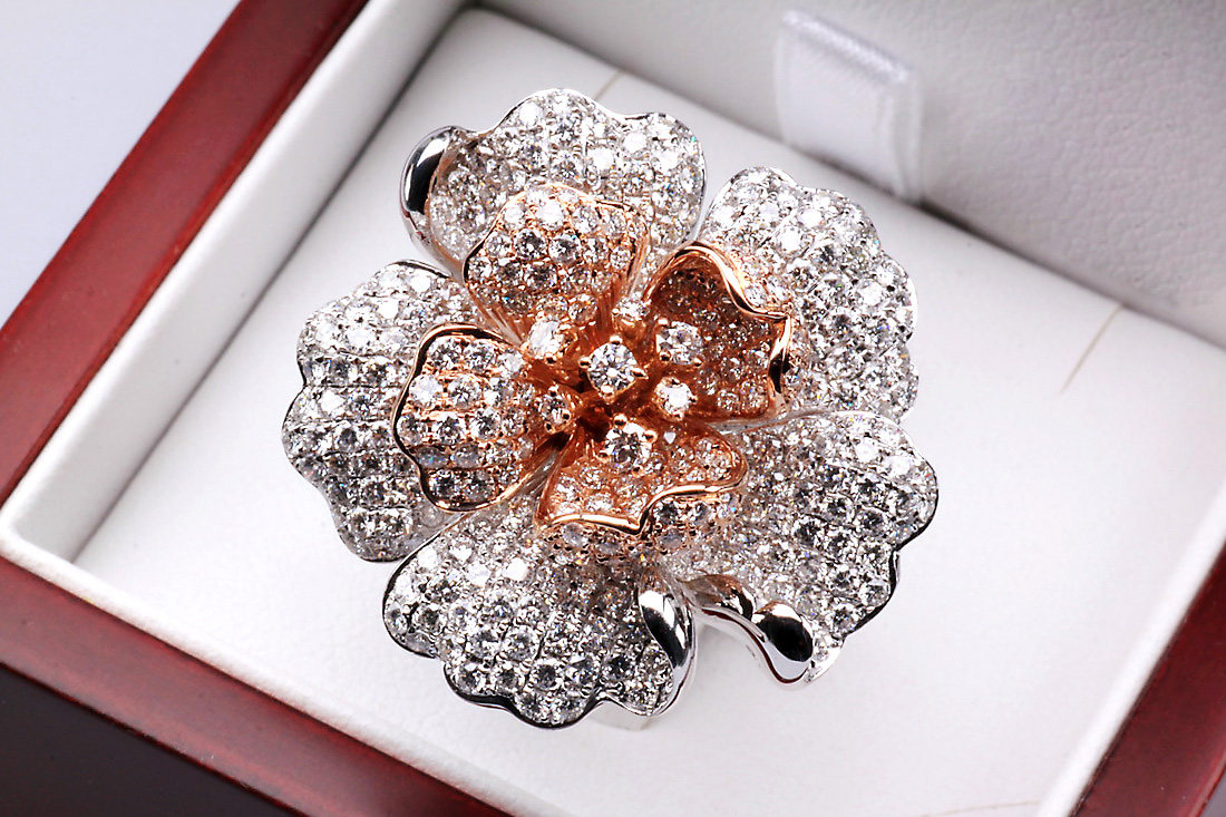 Nádherný prsten ve tvaru rozkvetlého květu, vyrobený z bílého a růžového zlata ryzosti 0,750. Každý okvětní lístek zdobí celkem 369 briliantových diamantů o celkové hmotnosti téměř 4 ct, které dodávají šperkům oslnivý třpyt a hloubku. Umělecký klenot, který potěší každou milovnici luxusu a výjimečného designu.