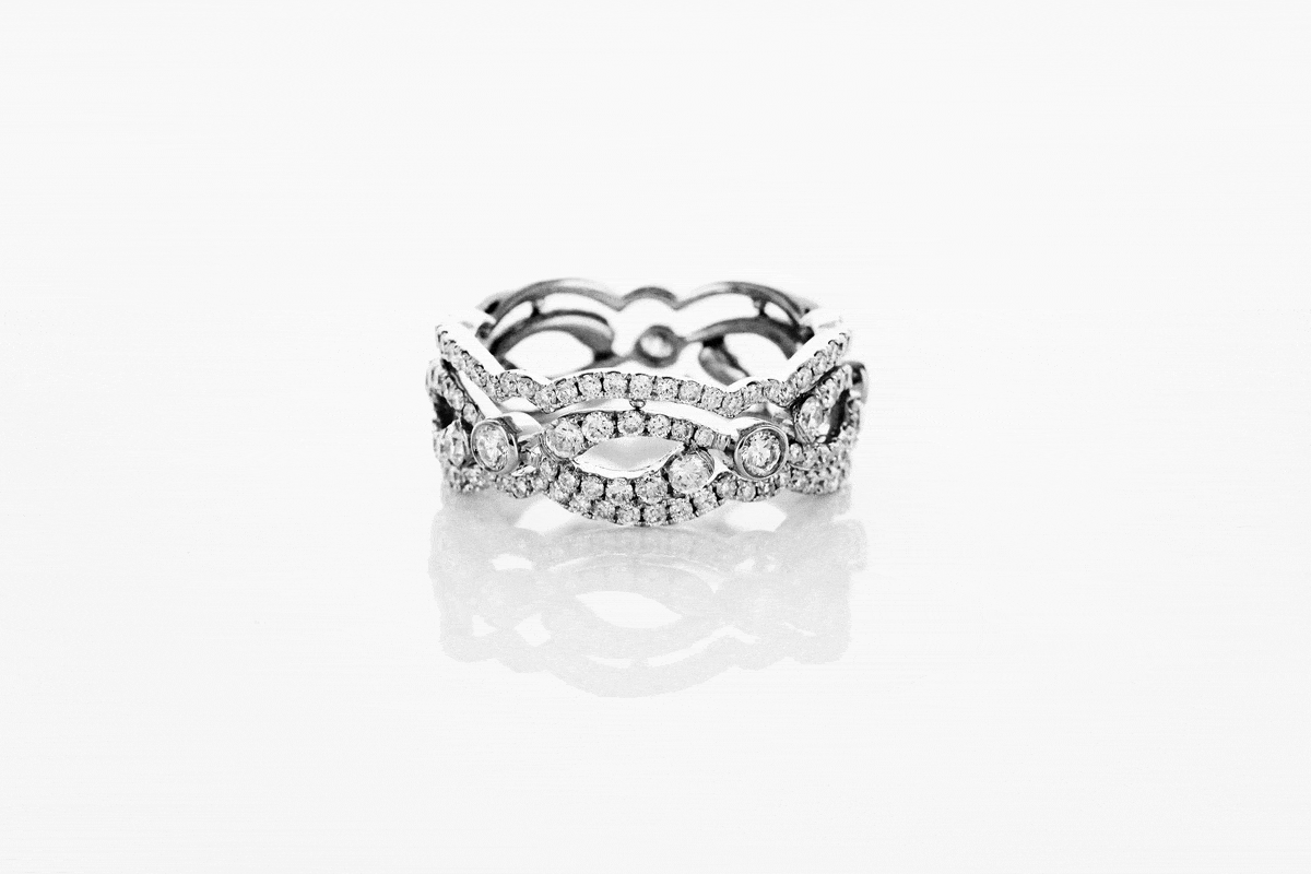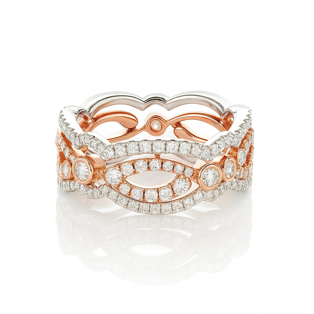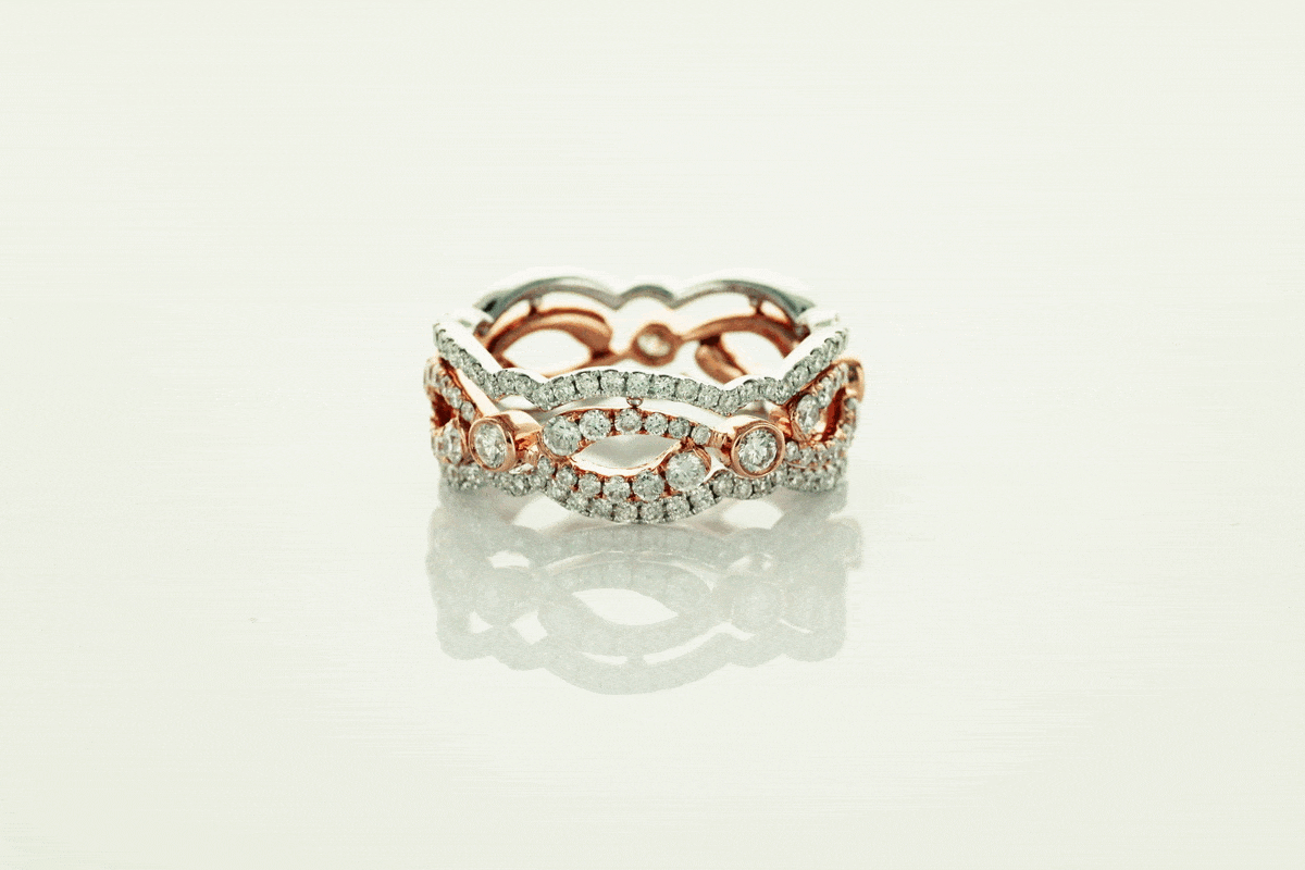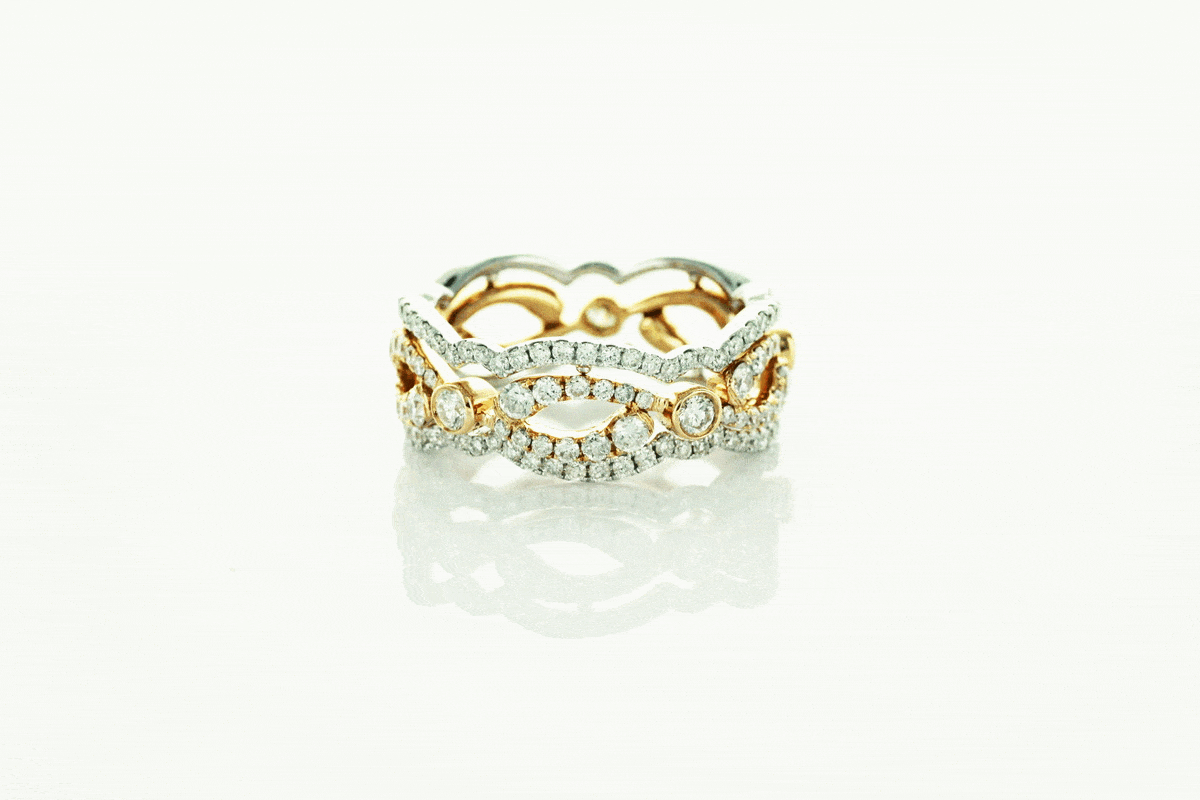 Výjimečná sada tří prstenů vyrobených ze žlutého, bílého a růžového zlata ryzosti 0,750, ozdobená 175 brilianty o celkové hmotnosti 1,56 ct. Každý prsten tvoří součást elegantní kompozice, kterou lze nosit společně nebo jednotlivě. Luxusní design, prvotřídní drahokamy a precizní zpracování dělají z této sady dokonalou volbu pro ženy, které si potrpí na šperky s jedinečným charakterem.