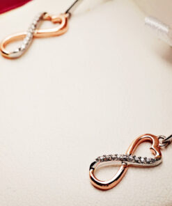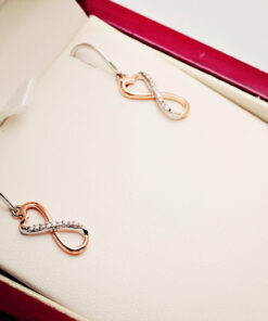 Okouzlující náušnice vyrobené z kombinace bílého a růžového zlata 585, které zaujmou svou elegancí a jemností. Motiv nekonečna přecházející do tvaru srdce symbolizuje věčnou lásku a harmonii. Třpytivé brilianty o celkové hmotnosti 0,07 ct nádherně odrážejí světlo a dodávají šperku jedinečný lesk. Ideální volba pro ženy, které si cení klasiky s romantickým nádechem. Náušnice krásně ladí s náramkem, prstenem a náhrdelníkem ze stejné kolekce.