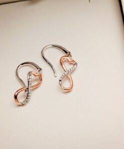 Zjawiskowe kolczyki wykonane z połączenia białego i różowego złota próby 585, które zachwycają elegancją i subtelnością. Delikatny motyw nieskończoności przechodzący w kształt serca symbolizuje wieczną miłość i harmonię. Lśniące brylanty o łącznej masie 0,07 ct pięknie odbijają światło, nadając biżuterii wyjątkowego blasku. To idealny wybór dla kobiet ceniących klasykę z nutą romantyzmu. Kolczyki doskonale komponują się z bransoletką, pierścionkiem i naszyjnikiem z tej samej kolekcji.