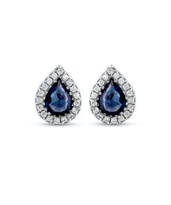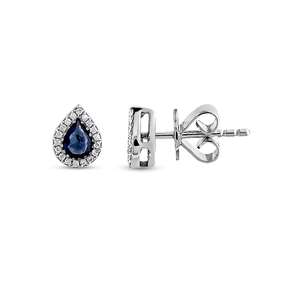 Stavení Naušnice. 36 Diamantů, briliantový výbrus, váha 0,08 ct., barva G, čistota VS2-SI1. 2 Safíry, váha 0,40 ct.. Bílé zlato 0,750. Velikosti 7x5 mm. Nádherné náušnice ve tvaru kapky se safíry a diamanty z 18K bílého zlata. K dispozici také ve žlutém nebo růžovém zlatě.