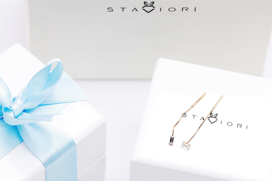 Staviori | Visací náušnice s překrásnými diamanty ve tvaru bagety z růžového zlata 585