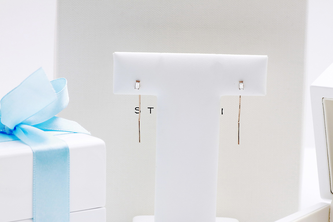 Stavení Naušnice. 2 Diamanty, bageta výbrus, váha 0,10 ct, barva H, čistota I1. Růžové zlato 0,585. Délka 36 mm. Velikosti 2,3x4,3 mm.