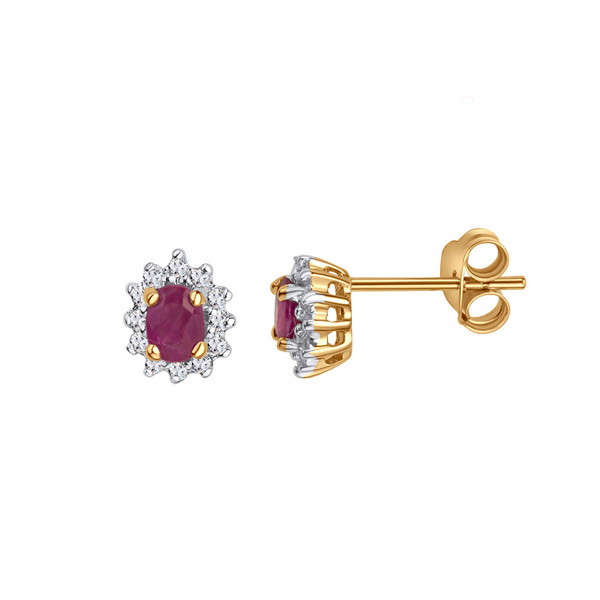 Nádherné náušnice ze žlutého zlata 585, s centrálními rubíny o celkové hmotnosti 0,50 ct, obklopené 24 jemně třpytivými diamanty ve starém brusu. Elegantní a výrazný šperk pro ženy, které milují nadčasový styl a syté barvy.