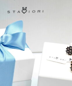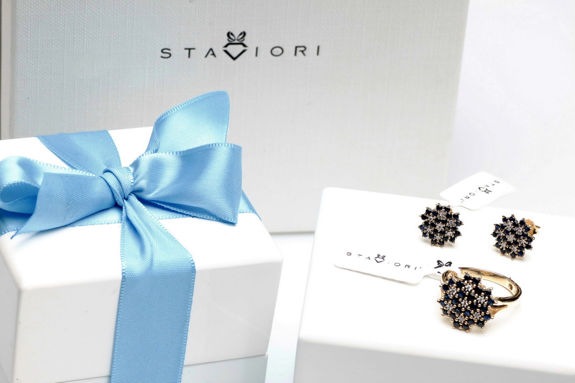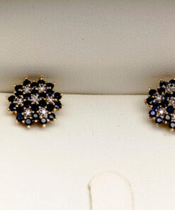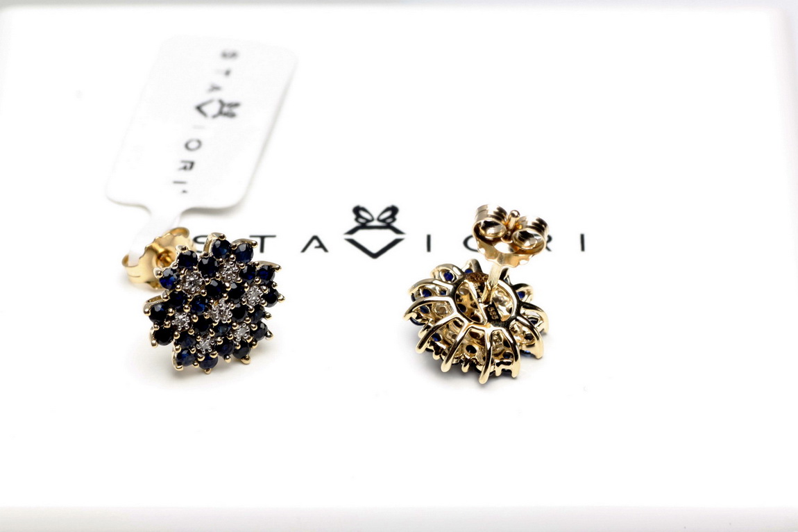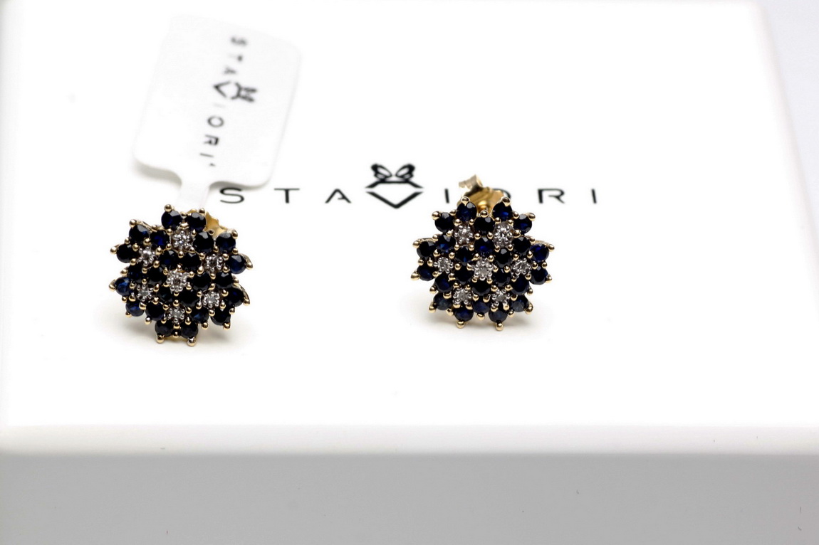 Staviori Naušnice. 14 Diamantů, achtkant výbrus, váha 0,056 ct., barva H, čistota SI2. 40 Safírů, váha 1,44 ct.. Žluté Zlato 0,585. Šířka 11 mm. Tloušťka 4 mm.