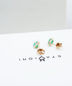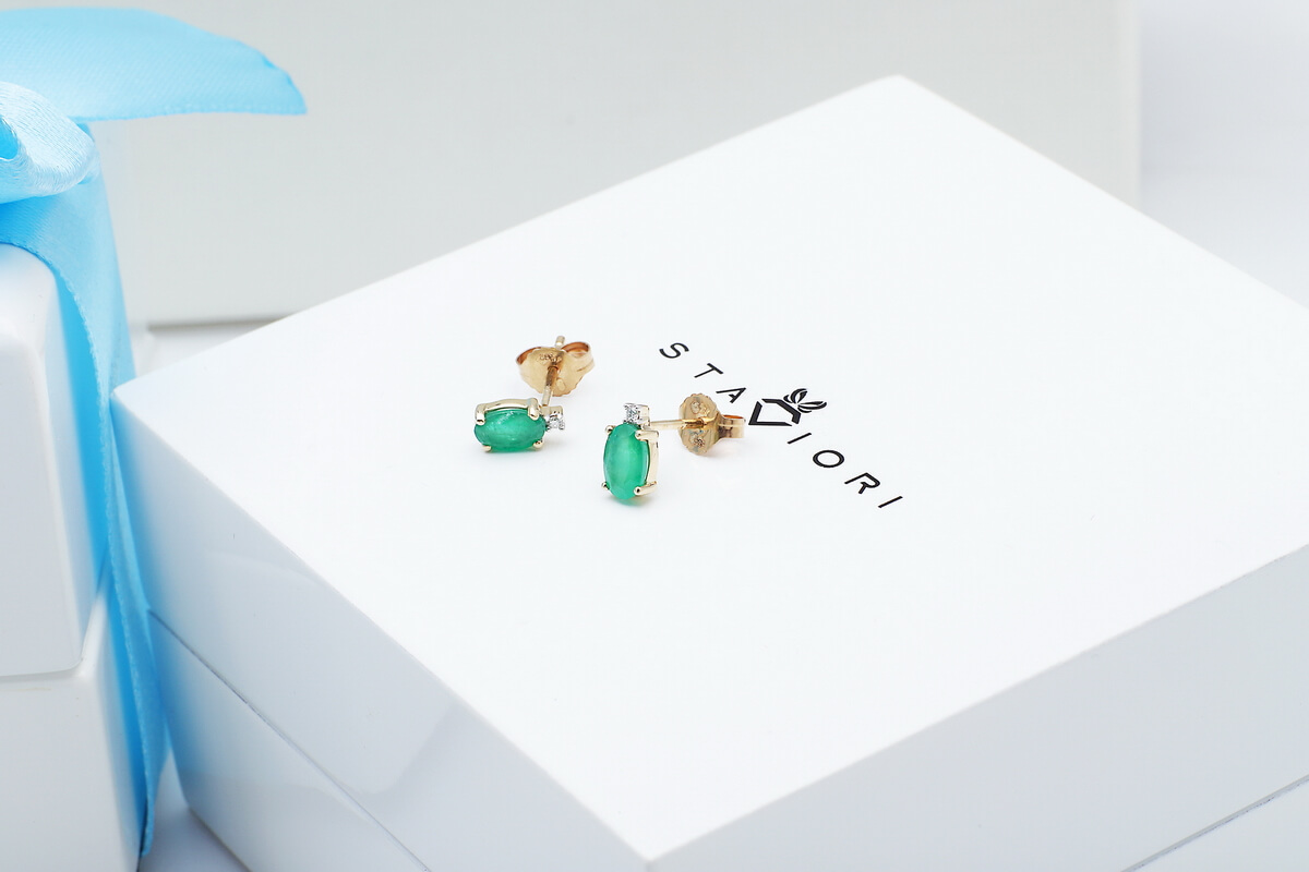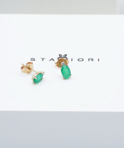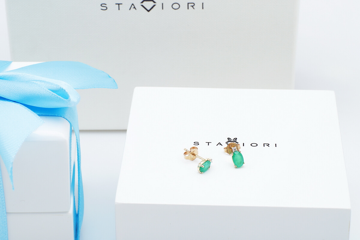 Staviori Naušnice. 2 Diamanty, briliantový výbrus, váha 0,02 ct., barva H-I, čistota I1. 2 Smaragdy, váha 0,30 ct.. Žluté Zlato 0,585. Velikosti 3x6 mm.