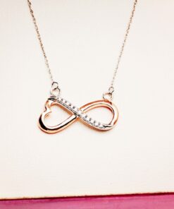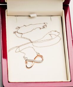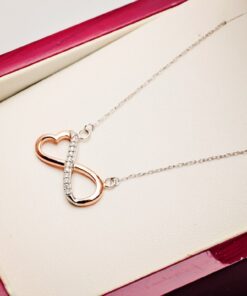 Fenomenální náhrdelník z bílého a růžového zlata 0.585 zdobený motivem srdce propleteného symbolem nekonečna. Celý šperk jemně prosvětlují přírodní diamanty s briliantovým brusem, které se při každém pohybu nádherně třpytí. Kombinace dvou barev zlata a třpytivých kamenů dodává šperku moderní a romantický charakter. Jedná se o jedinečnou nabídku pro ženy, které ocení originální styl a nadčasové symboly. Ideální dárek pro milovanou osobu nebo k významné příležitosti.