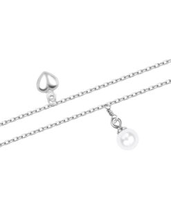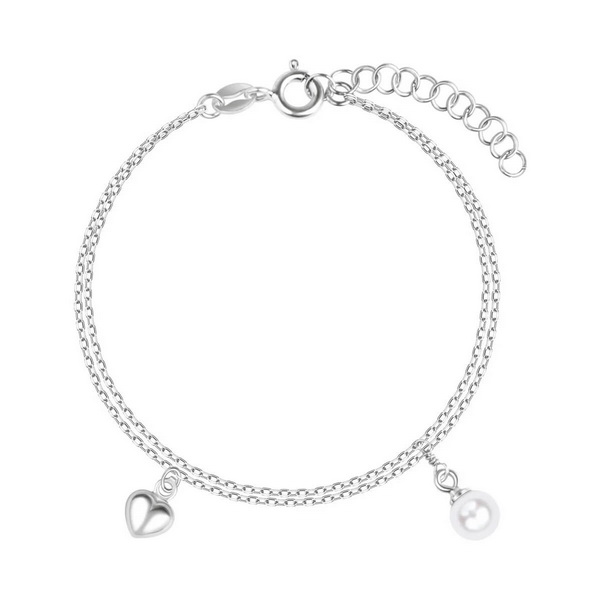 Jemný nastavitelný náramek z rhodiovaného stříbra ryzosti 925 v délce 16-19 cm. Model se zdvojeným řetízkem je ozdoben jednou bílou kulatou sladkovodní perlou a hladkým stříbrným srdíčkem. Velmi lehký a elegantní, zvýrazní ženskou jemnost a dodá outfitu nádech sofistikovanosti.