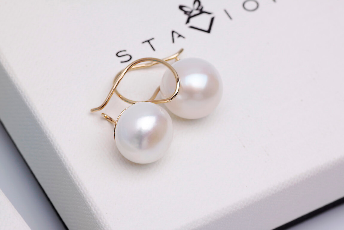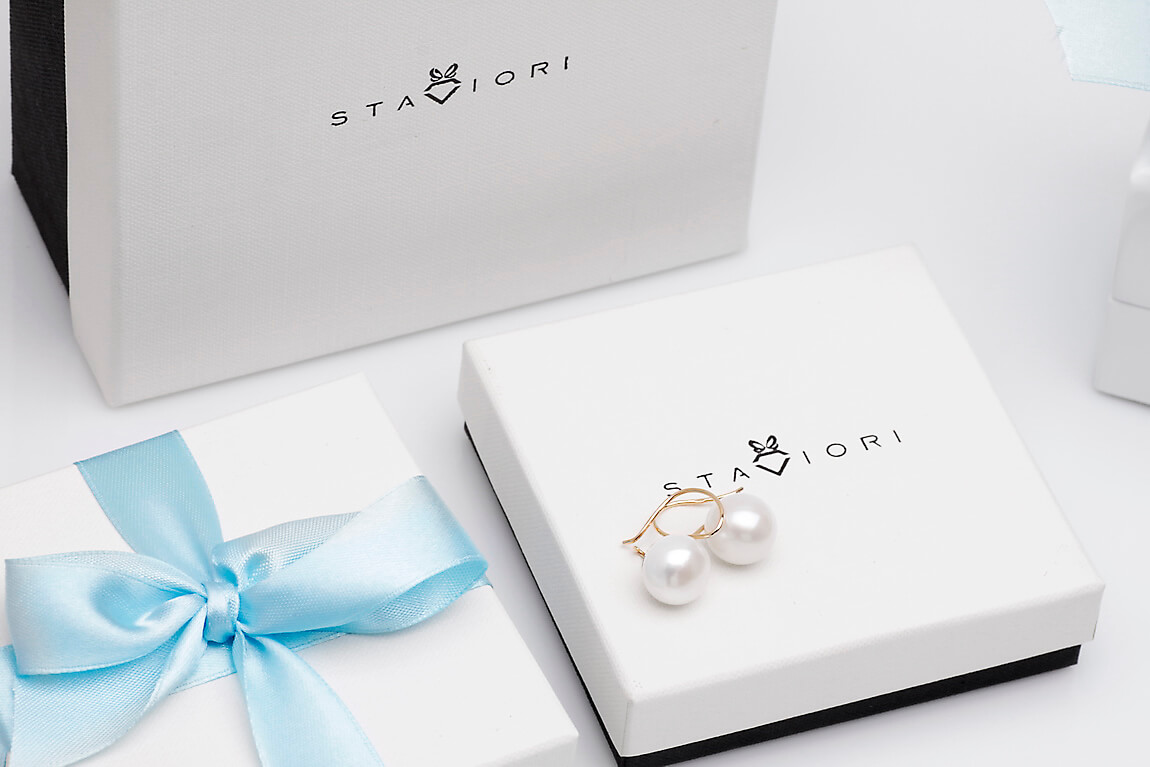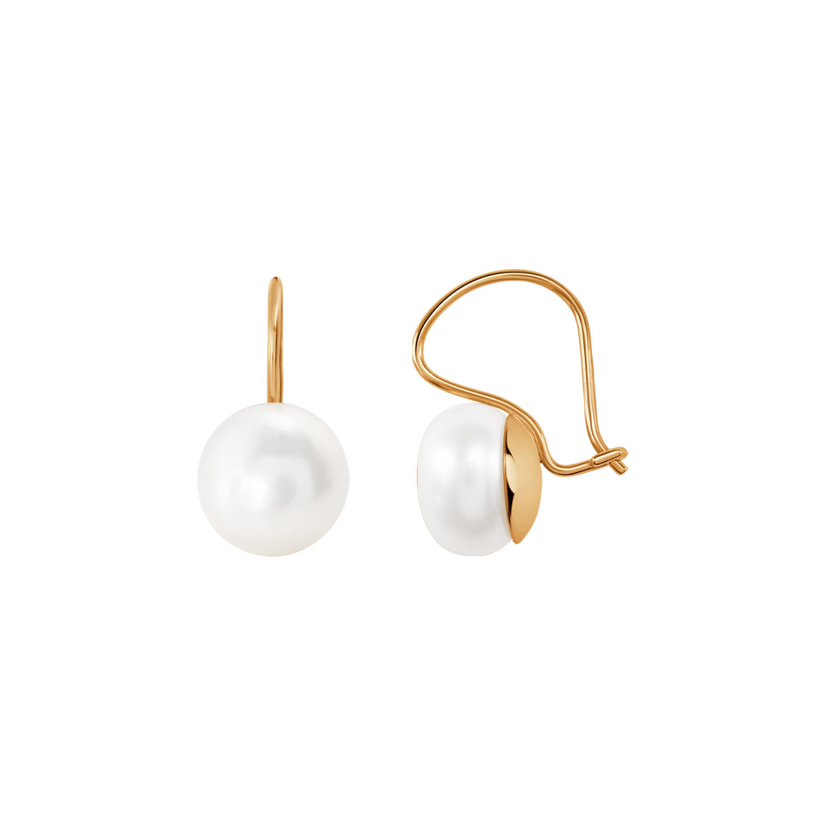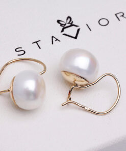 Staviori Naušnice. Přírodní Perly chovatelské sladkovodní. Bílé Kvalita B Šířka 10-12,5 mm. Žluté Zlato 0,585. Délka 23 mm. Pozor: každá Perla je přírodním dílem, a proto každy perlovy výrobek a samotné Perly nejsou identické.