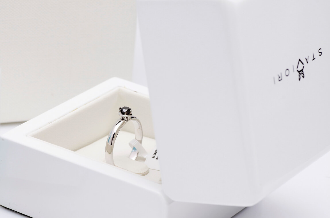 Staviori Prsten. 1 Diamant, barva černá, briliantový výbrus, váha 0,25 ct.. Bílé zlato 0,750. Koruna: průměr kolem 5 mm. Šířka prstýnku kolem 3 mm. Mefisto... Tajemný předmět touhy v dokonalém tvaru. Přírodní černý briliant a nejryzejší bílé zlato na Tebe udělají neobvyklý dojem.