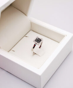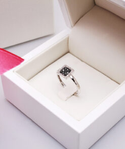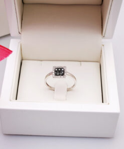 Wyjątkowy pierścionek z białego złota próby 0,585, który zachwyca oryginalnym geometrycznym wzorem. W centrum znajduje się dziewięć czarnych diamentów o łącznej masie 0,135 ct, tworzących efektowną, kwadratową kompozycję. Otacza je 16 białych diamentów o masie 0,08 ct, które subtelnie kontrastują z ciemnym środkiem, podkreślając elegancję i nowoczesność pierścionka. To odważna i stylowa propozycja dla kobiet ceniących unikalny design.