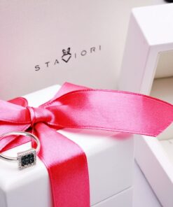 Staviori Prsten. 16 Diamantů, briliantový výbrus, váha 0,08 ct., barva H, čistota I1. 9 Diamantů, barva černý, briliantový výbrus, váha 0,135 ct.. Bílé Zlato 0,585. Šířka 8 mm. Šířka prstýnku kolem 2 mm.