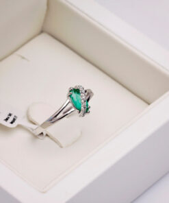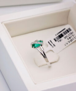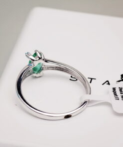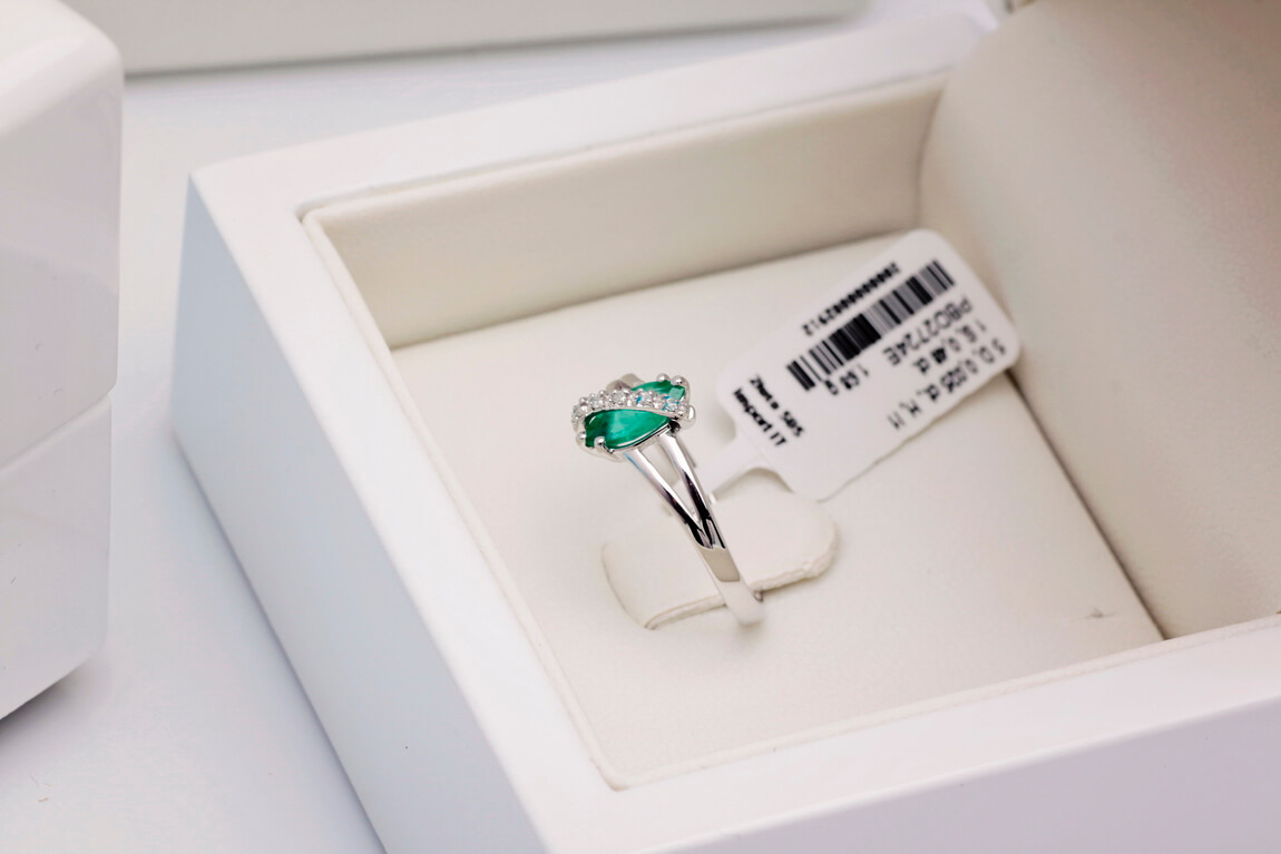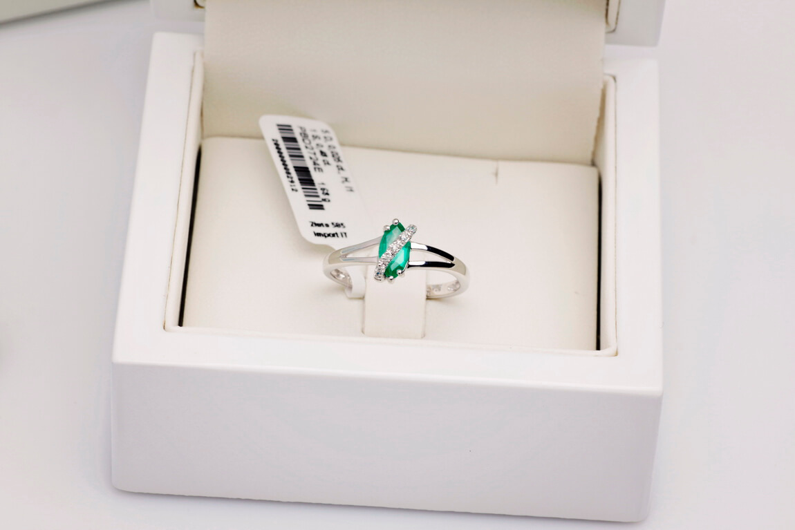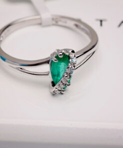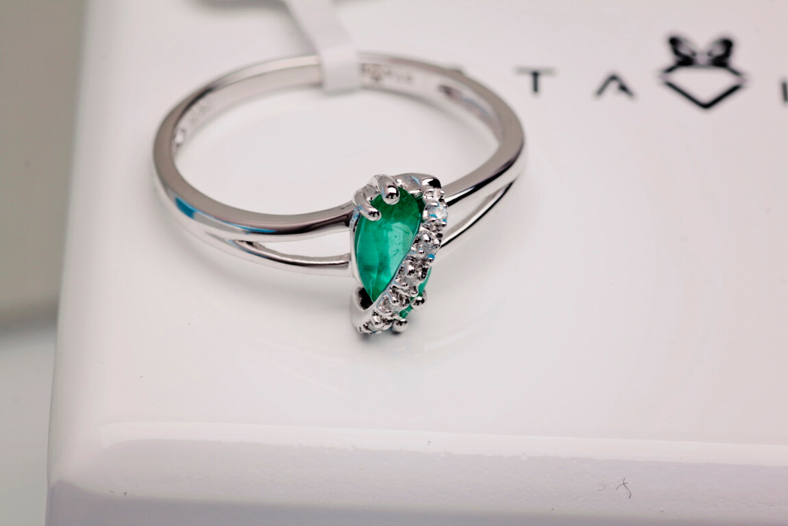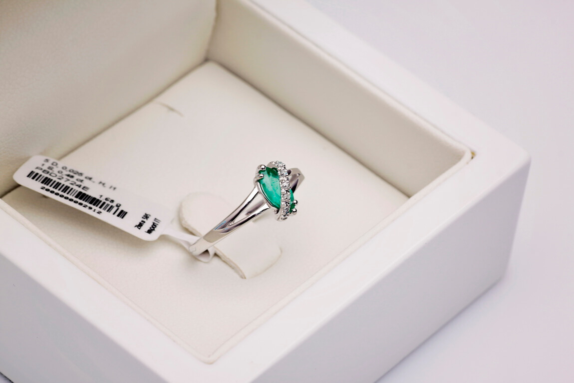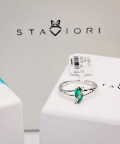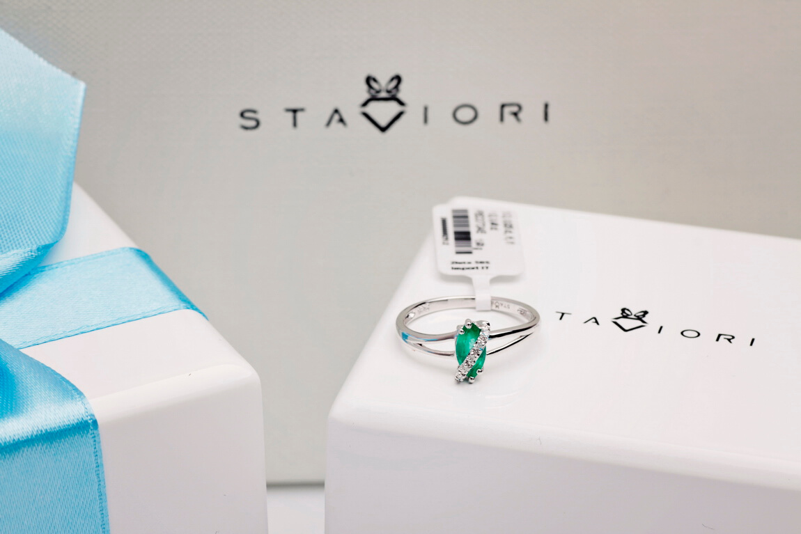 Staviori Prsten. 5 Diamantů, briliantový výbrus, váha 0,025 ct., barva H, čistota I1. 1 Smaragd, váha 0,48 ct. Bílé zlato 0,585. Koruna: průměr kolem 5x10 mm.