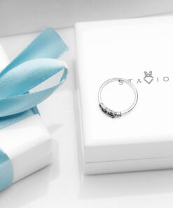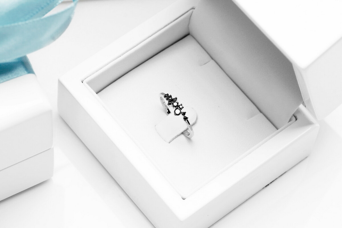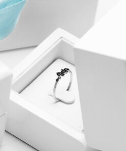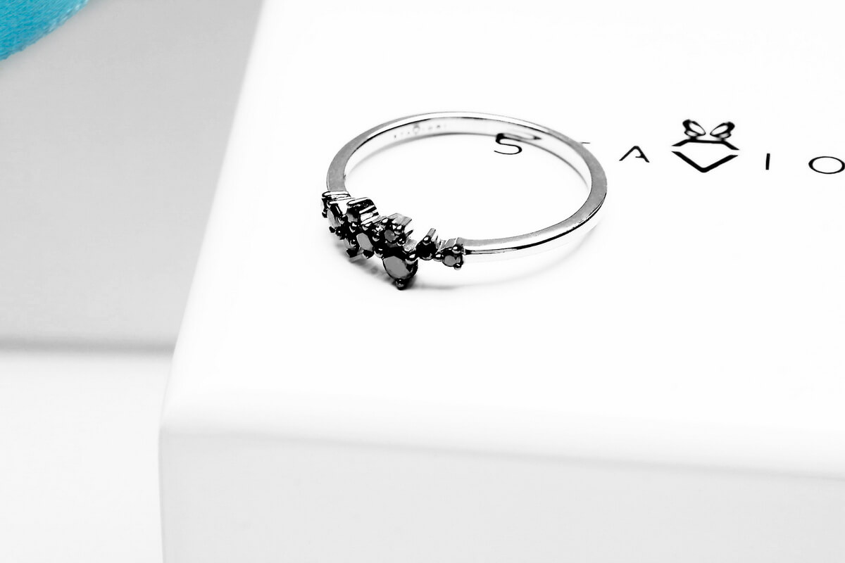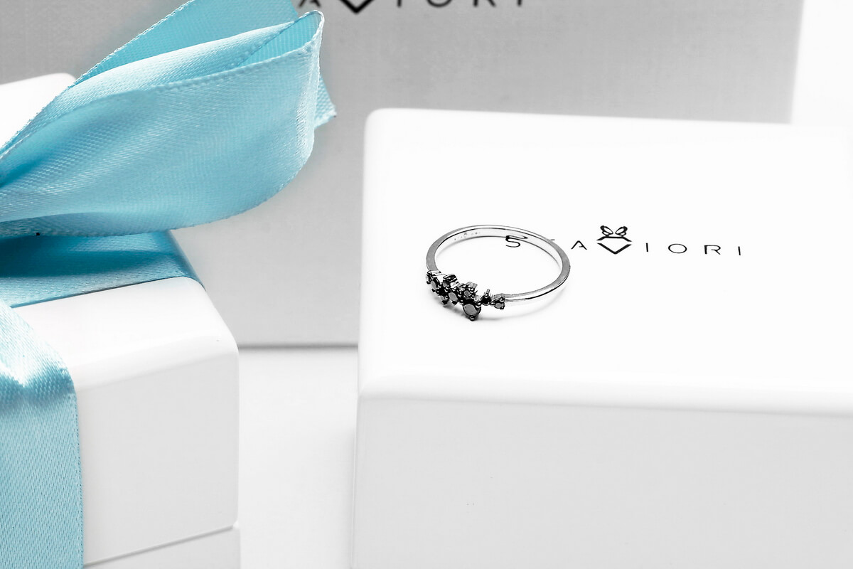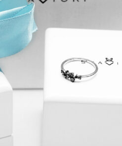 Intrygujący pierścionek z białego złota próby 0,585 ozdobiony dziewięcioma czarnymi diamentami o szlifie brylantowym. Kompozycja nieregularnie rozmieszczonych kamieni tworzy subtelną, a jednocześnie wyrazistą formę, idealną dla miłośniczek nowoczesnej i odważnej biżuterii. Delikatna obrączka harmonijnie podkreśla kontrast pomiędzy bielą złota a głębią czerni. Ten model doskonale sprawdzi się zarówno na co dzień, jak i jako wyjątkowy akcent stylizacji wieczorowej.