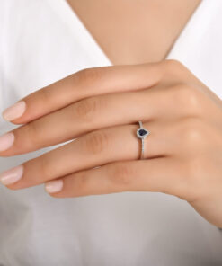 Zjawiskowy pierścionek z białego złota próby 0,750, w którym główną rolę gra szafir o masie 0,31 ct., oszlifowany w elegancki kształt łezki. Otoczony aż 30 lśniącymi diamentami w szlifie brylantowym, tworzy kompozycję pełną blasku i finezji. Delikatna obrączka z dodatkowym diamentowym zdobieniem nadaje całości lekkości i luksusowego charakteru. To pierścionek dla kobiety, która kocha wyrafinowane detale i niebanalną elegancję.
