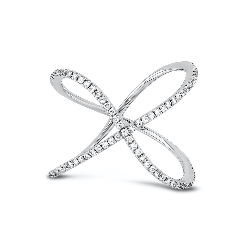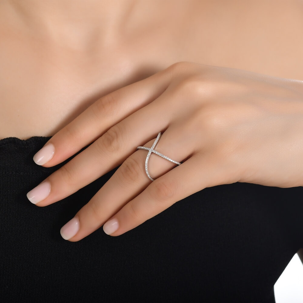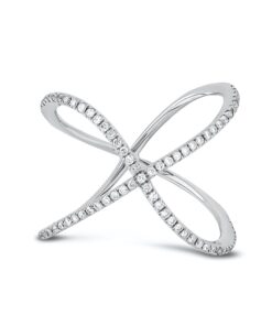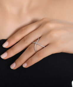 Nowoczesny pierścionek z białego złota próby 0,750, którego forma zachwyca geometrycznym krzyżującym się wzorem. Aż 32 diamenty w szlifie brylantowym o łącznej masie 0,32 ct subtelnie połyskują na finezyjnych liniach złota, tworząc kompozycję pełną blasku i charakteru. To biżuteria idealna dla kobiet, które cenią odważny design i unikalny styl z nutą elegancji.