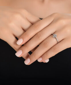 Urokliwy pierścionek z białego złota próby 0,750, ozdobiony centralnym diamentem o masie 0,04 ct, umieszczonym w fantazyjnej oprawie w kształcie łezki. Kompozycję dopełniają 34 drobne diamenty o łącznej masie 0,13 ct, które rozświetlają obrączkę i kontur oprawy, dodając całości wyjątkowego blasku. To subtelna i pełna wdzięku biżuteria, idealna na prezent lub wyjątkowy gest miłości.