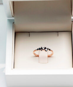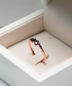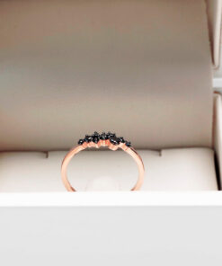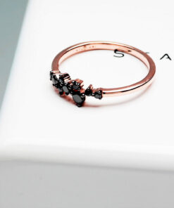Zachwycający pierścionek z różowego złota, ozdobiony dziewięcioma czarnymi diamentami o łącznej masie 0,20 ct. Elegancka kompozycja kamieni tworzy subtelny, a zarazem nowoczesny wzór, który przyciąga spojrzenia. Delikatna, smukła obrączka idealnie podkreśla kontrast pomiędzy głęboką czernią diamentów a ciepłym odcieniem złota. Doskonały wybór dla kobiet ceniących nietuzinkowe, stylowe dodatki z nutą tajemniczości.