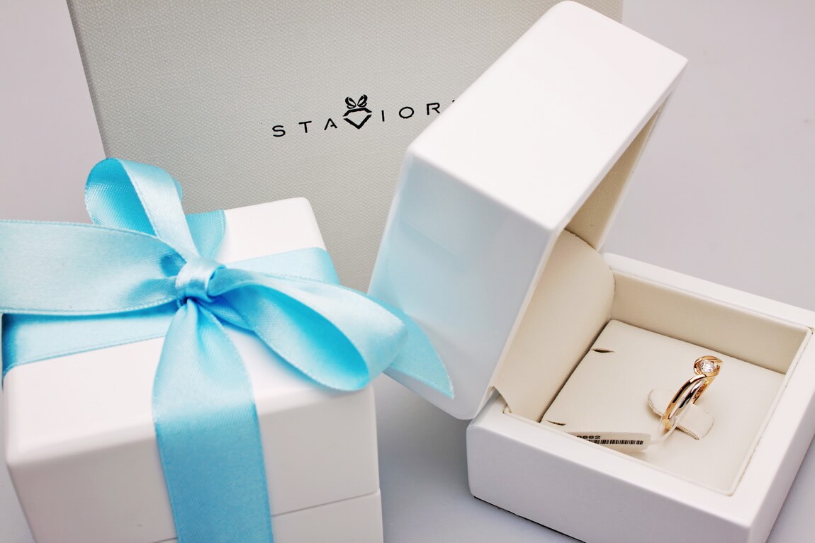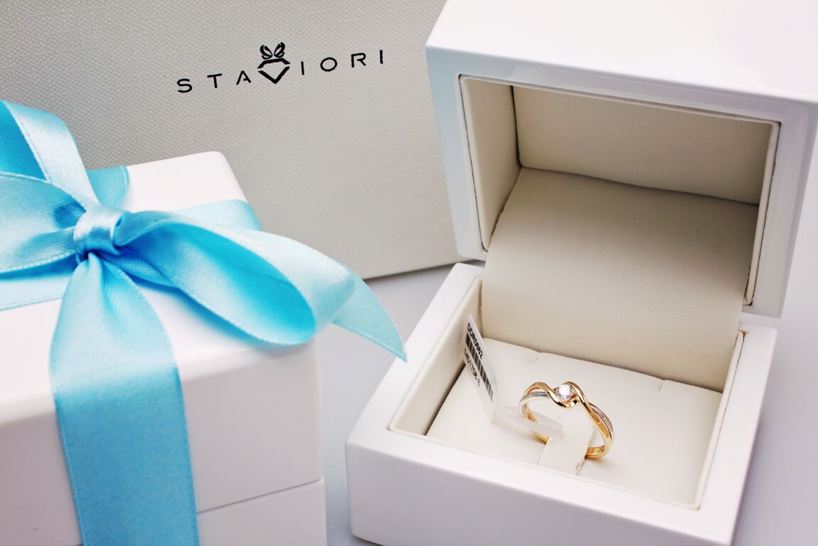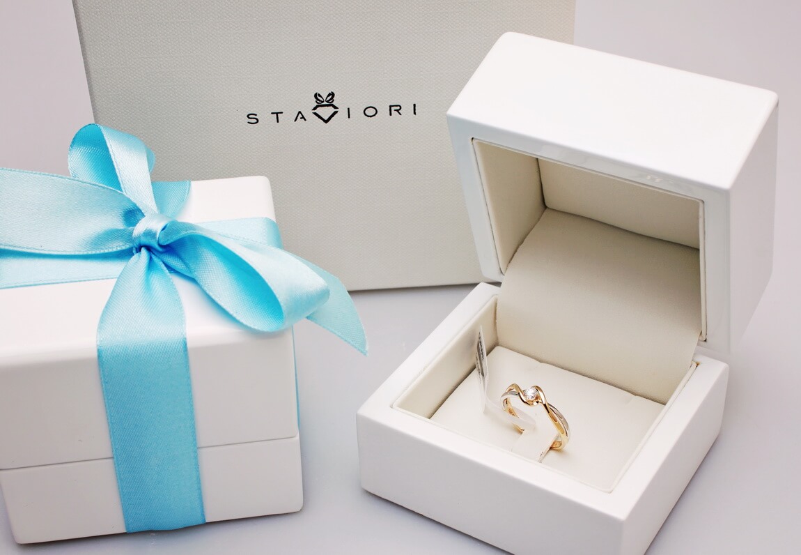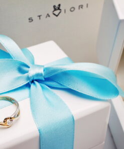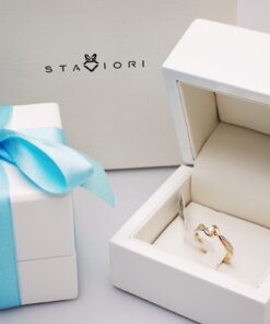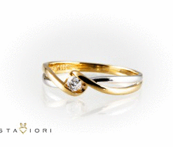 Staviori Prsten. 1 Diamant, briliantový výbrus, váha 0,15 ct., barva G, čistota SI1. Žluté, Bílé Zlato 0,585. Šířka 5,5-2 mm. Výška 3,5 mm. Je k dostání také s libovolným briliantem na individuální přání.