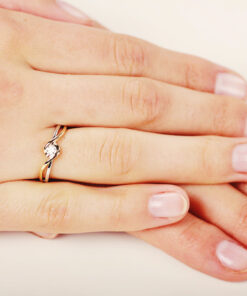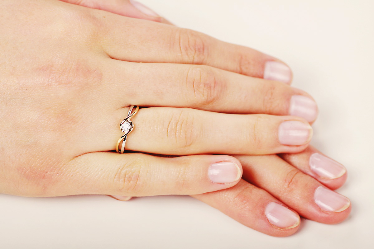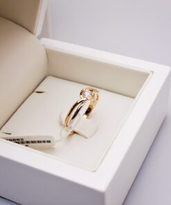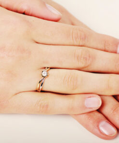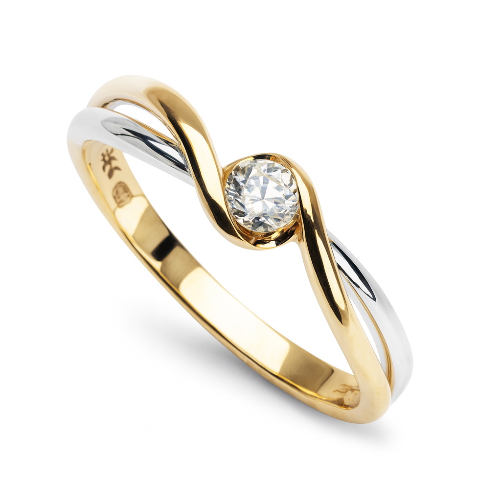Pierścionek zaręczynowy w nietuzinkowym stylu, łączący klasykę z nowoczesnym designem. Harmonijnie splecione pasma żółtego i białego złota próby 0,585 otulają olśniewający diament o masie 0,15 ct w szlifie brylantowym. Falująca linia oprawy subtelnie podkreśla blask kamienia, tworząc wyjątkowo kobiecą i romantyczną formę. Idealny dla kobiet poszukujących elegancji z nutą indywidualności.