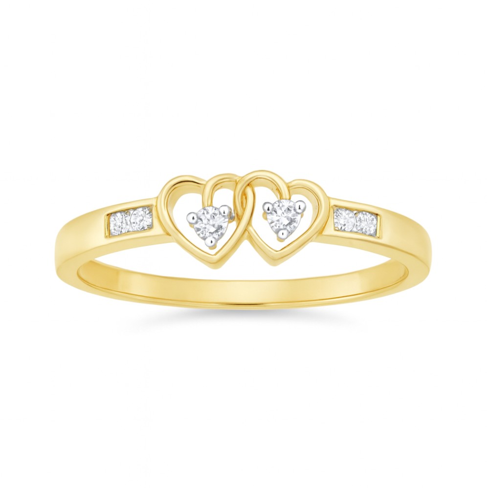 Złoty pierścionek z 14-karatowego żółtego złota, w którym centralnym motywem są dwa splecione serca – symbol miłości i nierozerwalnej więzi. Każde serce zdobi lśniący diament o szlifie brylantowym, a dodatkowe kamienie osadzone w obrączce podkreślają blask całości. To wyjątkowa biżuteria, idealna jako prezent pełen uczuć lub romantyczny symbol na zaręczyny.
