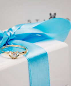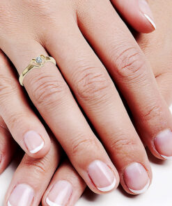 Romantyczny pierścionek zaręczynowy z 14-karatowego złota, którego sercem jest subtelny diament o szlifie brylantowym. Kamień osadzony został w misternie uformowanym motywie serca, symbolizującym miłość i oddanie. Delikatna forma oraz ponadczasowa elegancja sprawiają, że to idealny wybór na wyjątkowe oświadczyny, a także prezent pełen uczuć.