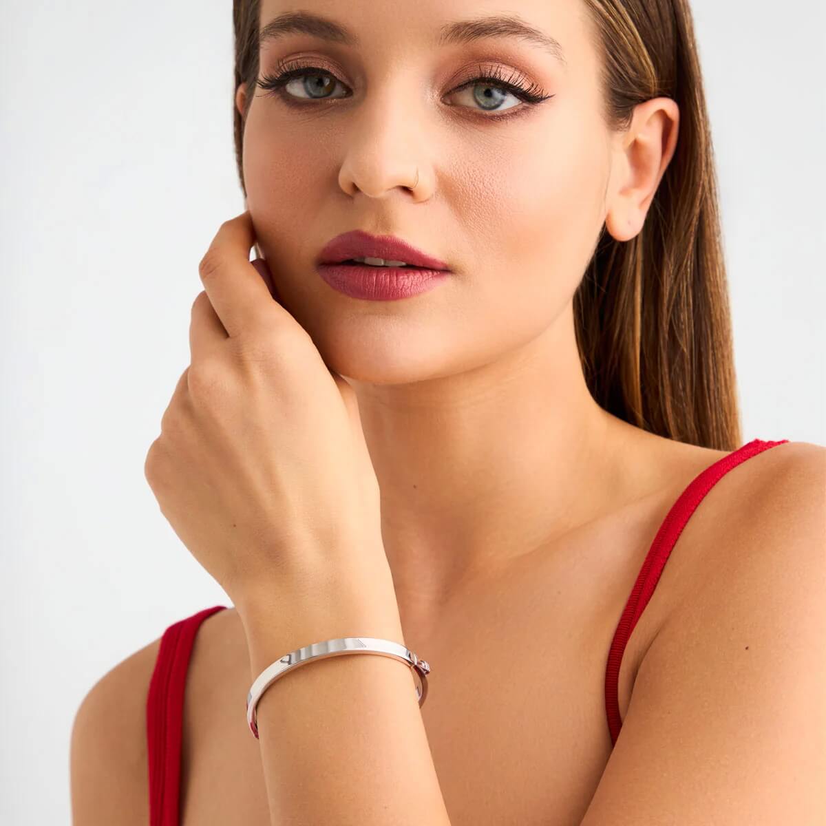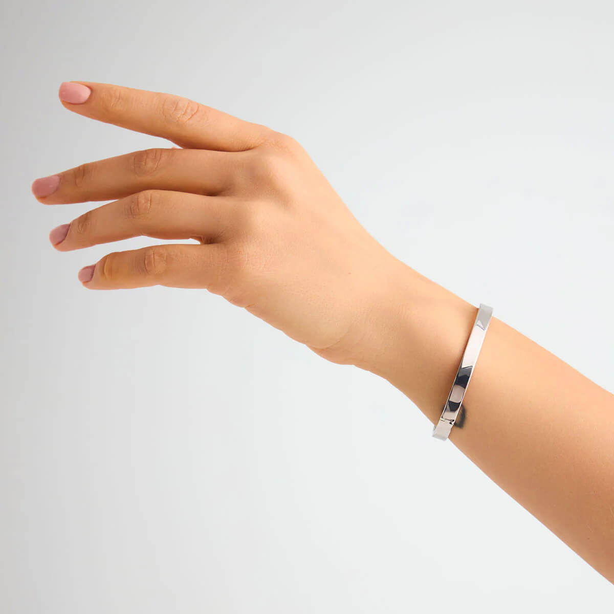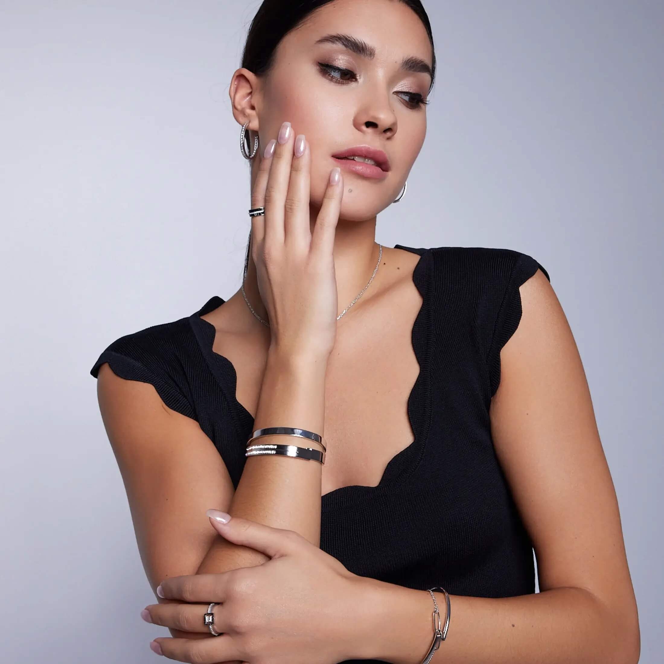 Minimalistický bangle náramek z rhodiovaného stříbra ryzosti 925 o délce 19 cm a šířce 6 mm. Jeho čistý klasický tvar elegantně zvýrazní zápěstí a přidá decentní nádech sofistikovanosti denním i večerním outfitům.