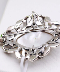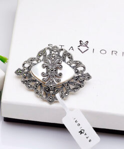 Stylowa broszka o kunsztownym, ażurowym wzorze, wykonana z rodowanego srebra próby 0,925. Jej centralnym elementem jest subtelnie połyskująca masa perłowa, otoczona błyszczącymi markazytami, które nadają całości elegancji i klasycznego uroku. Dzięki specjalnemu zapięciu broszka może być również noszona jako wisiorek, co czyni ją uniwersalnym dodatkiem na wiele okazji.