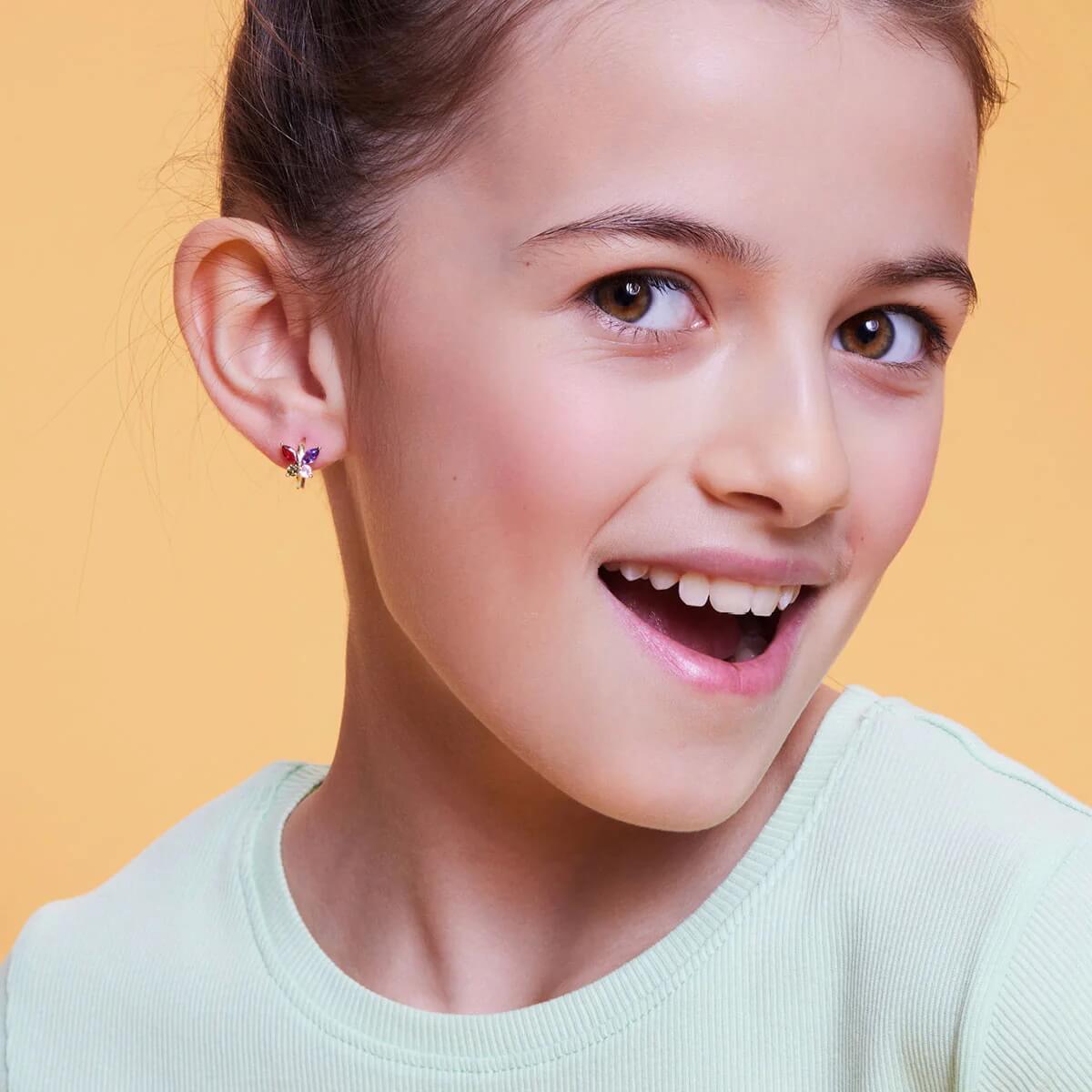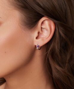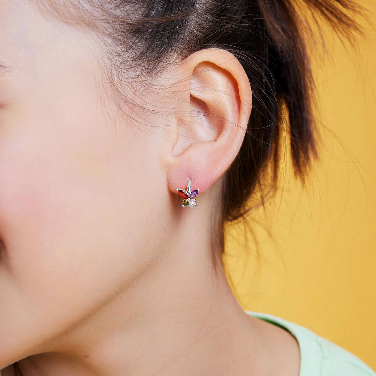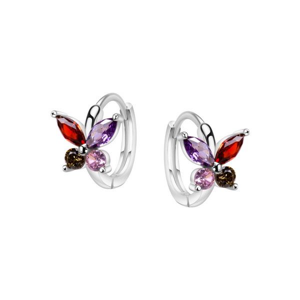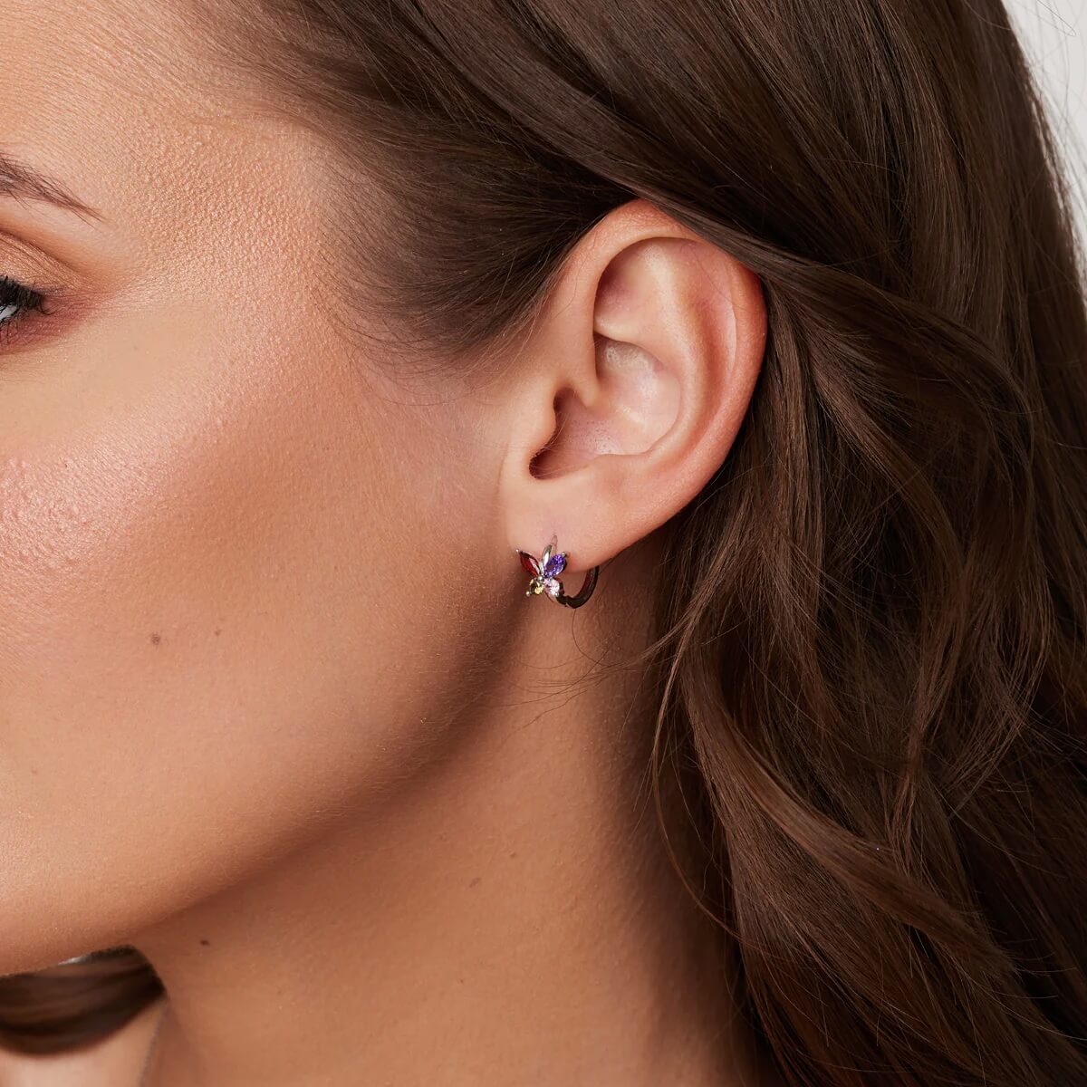 Delikatne kolczyki w kształcie motyli, wykonane z rodowanego srebra próby 0,925. Ozdobione kolorowymi cyrkoniami w odcieniach czerwieni, fioletu, różu i czerni, przyciągają wzrok subtelnym blaskiem i bajkową formą. Zapięcie typu szarnir zapewnia wygodę noszenia i bezpieczeństwo. Idealne do codziennego noszenia oraz jako wyjątkowy dodatek do eleganckich stylizacji.