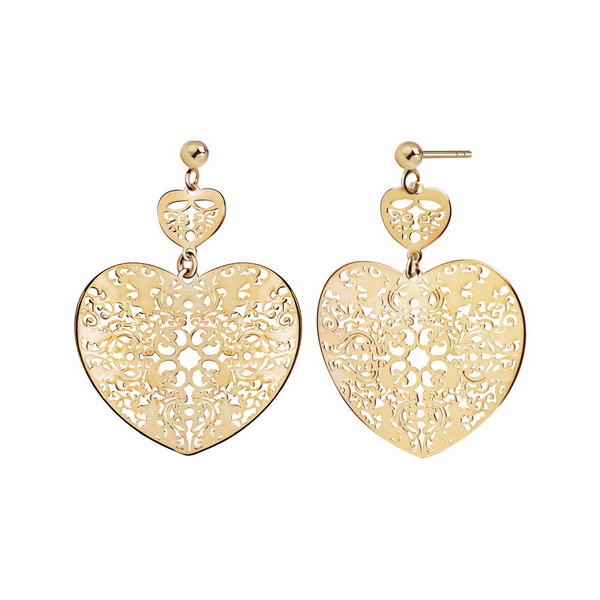 Nádherné náušnice ve tvaru srdce vyrobené ze stříbra ryzosti 0,925, pozlacené žlutým zlatem. Filigránový vzor jim dodává romantický a lehký vzhled, jemné detaily krásně odrážejí světlo. Vhodné pro slavnostní chvíle i každodenní nošení. Zavírání na puzetu zaručuje pohodlné a bezpečné nošení.