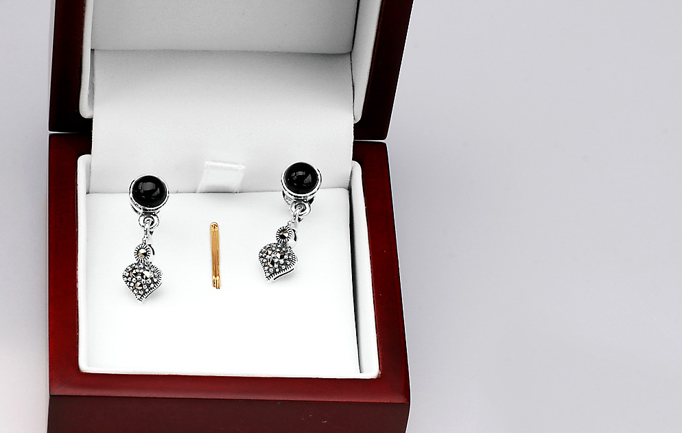 Okouzlující náušnice z rhodiovaného stříbra, zdobené tmavě černým onyxem a klasickými markazity. Horní část s hladkým kabošonem krásně kontrastuje s bohatě zdobeným prvkem ve tvaru srdce a vytváří tak šperk připomínající vintage. Je ideální volbou pro ženy, které ocení eleganci s nádechem tajemna a jedinečný styl.