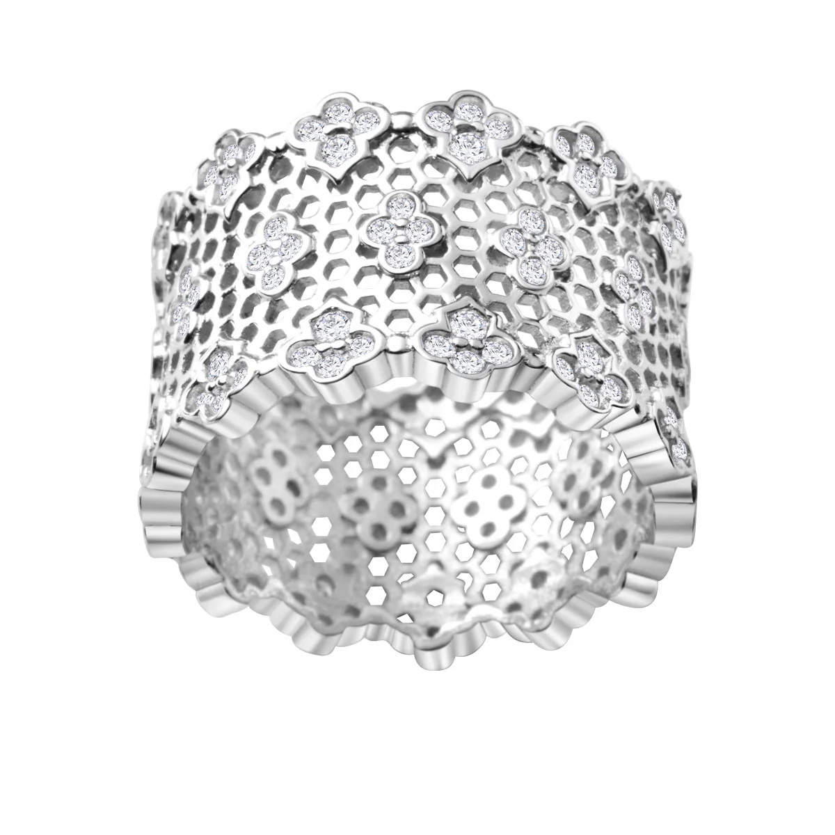 Zachwycający pierścionek wykonany z rodowanego srebra próby 0,925 o misternym ażurze w kształcie plastra miodu. Delikatne motywy kwiatowe, wysadzane lśniącymi cyrkoniami, nadają całości niezwykłej lekkości i biżuteryjnego kunsztu. To idealny wybór dla kobiet ceniących nowoczesną elegancję z odrobiną fantazji.