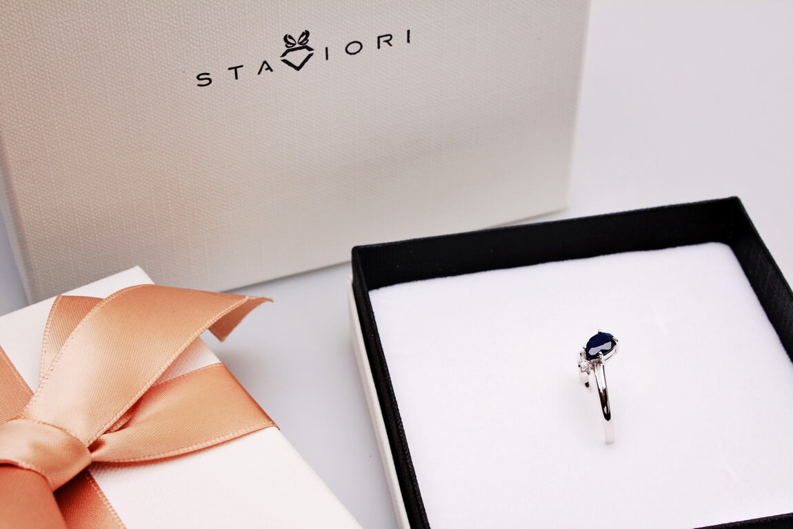 Staviori Prsten. 1 Safír, váha 0,80 ct.. Zirkony. Stříbro 0,925. Koruna: průměr kolem 8x9 mm. Výška 5 mm. POZOR! Tyto kameny jsou přírodní a jako dílo přírody nemusí být dokonalé. Přírodní viditelné inkluze nebo praskliny nejsou závadou kamenů.