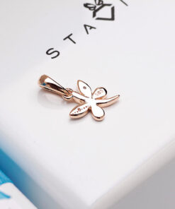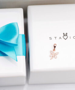 Uroczy wisiorek w kształcie motyla wykonany z połączenia różowego i białego złota próby 0,585. Skrzydełka zdobione delikatnym diamentem w szlifie achtkant pięknie odbijają światło, tworząc efekt subtelnego blasku. Symbol przemiany, lekkości i piękna — idealny dla kobiety, która ceni elegancję i wyjątkowe detale.